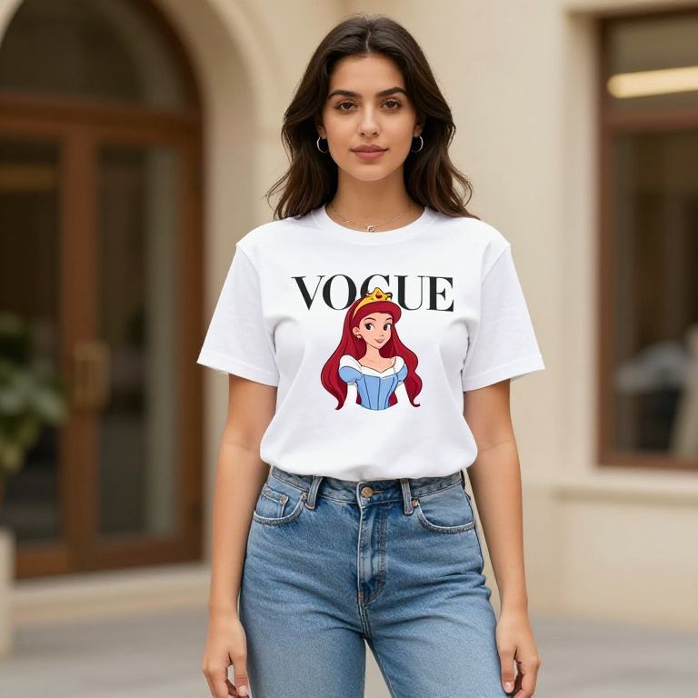 "Vogue Disney Princess Shirt, girl in a white shirt and jeans posing for a picture"