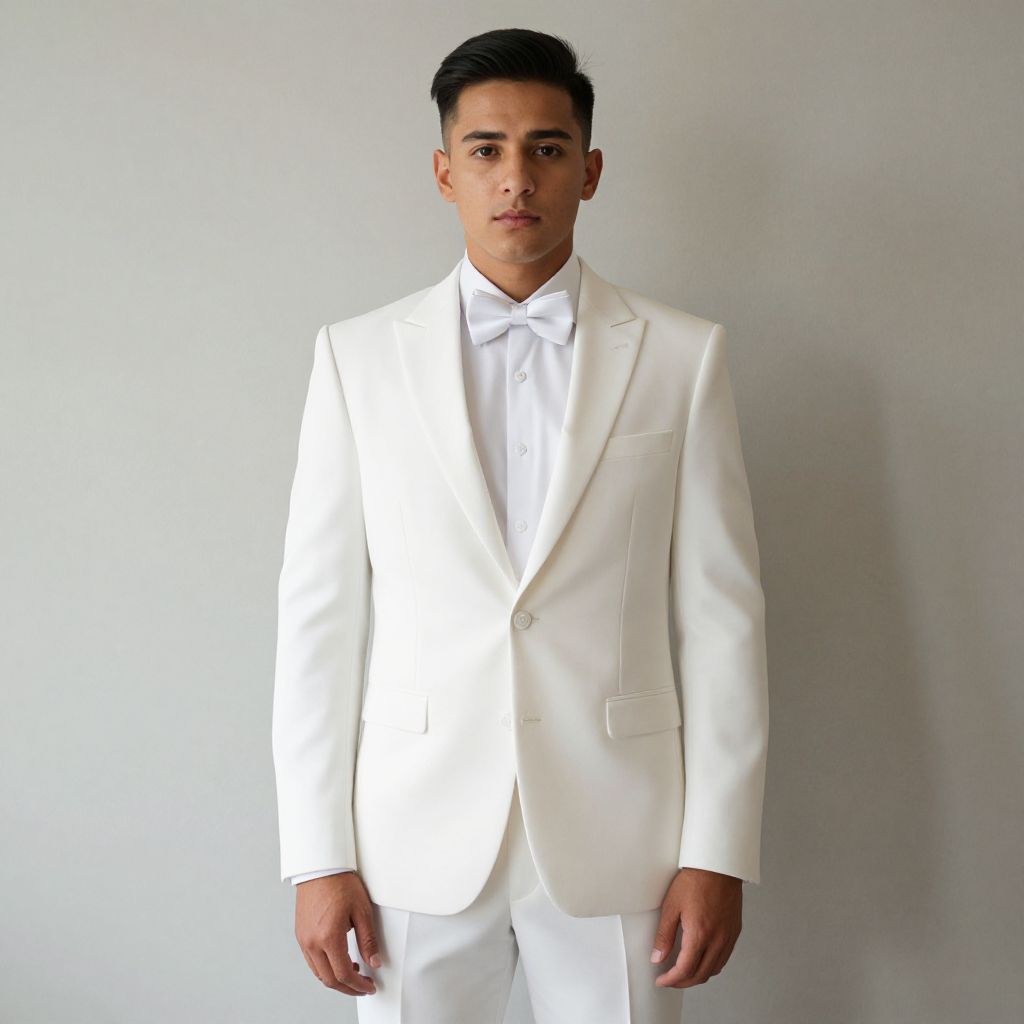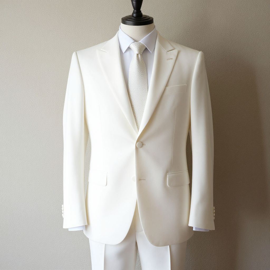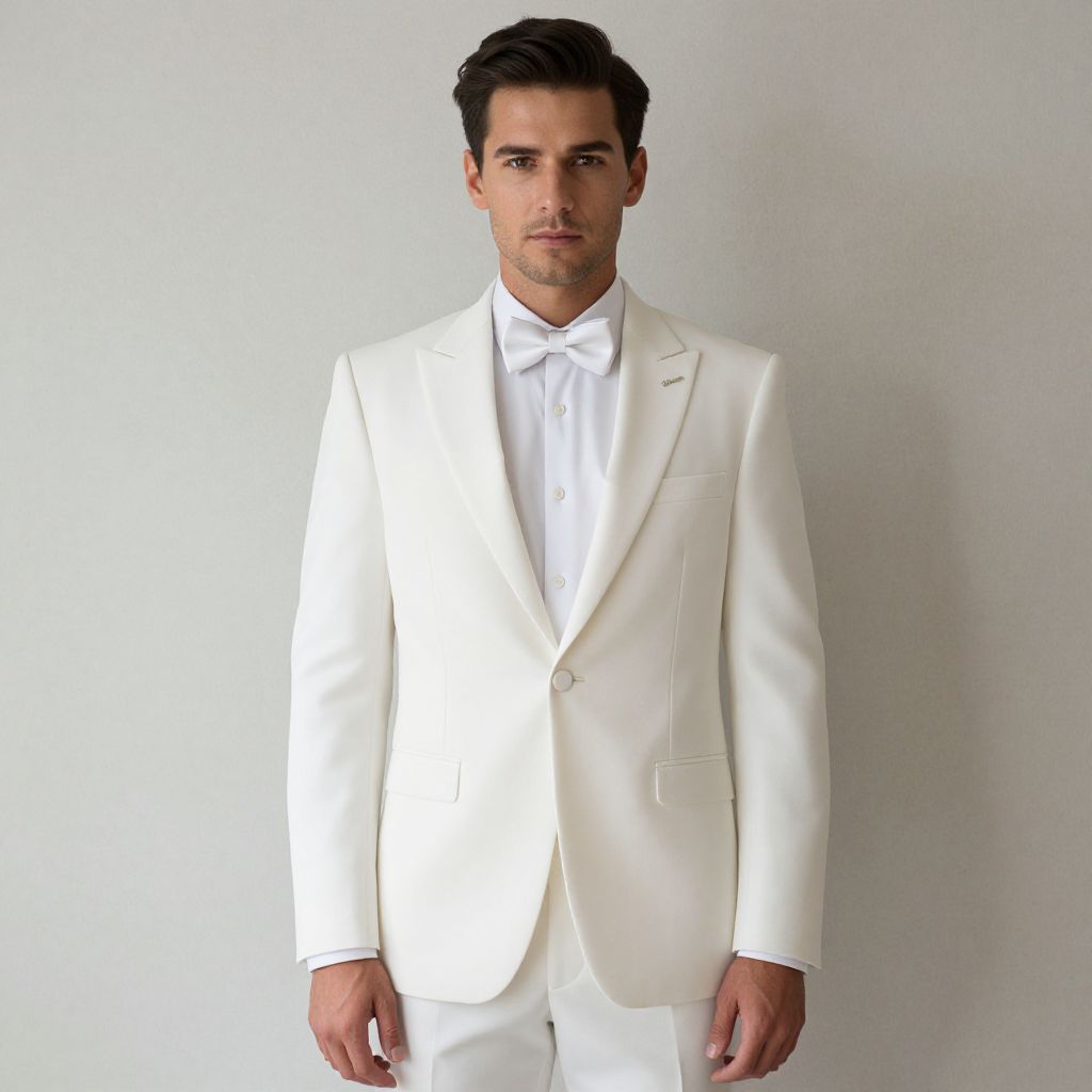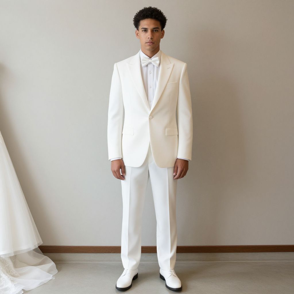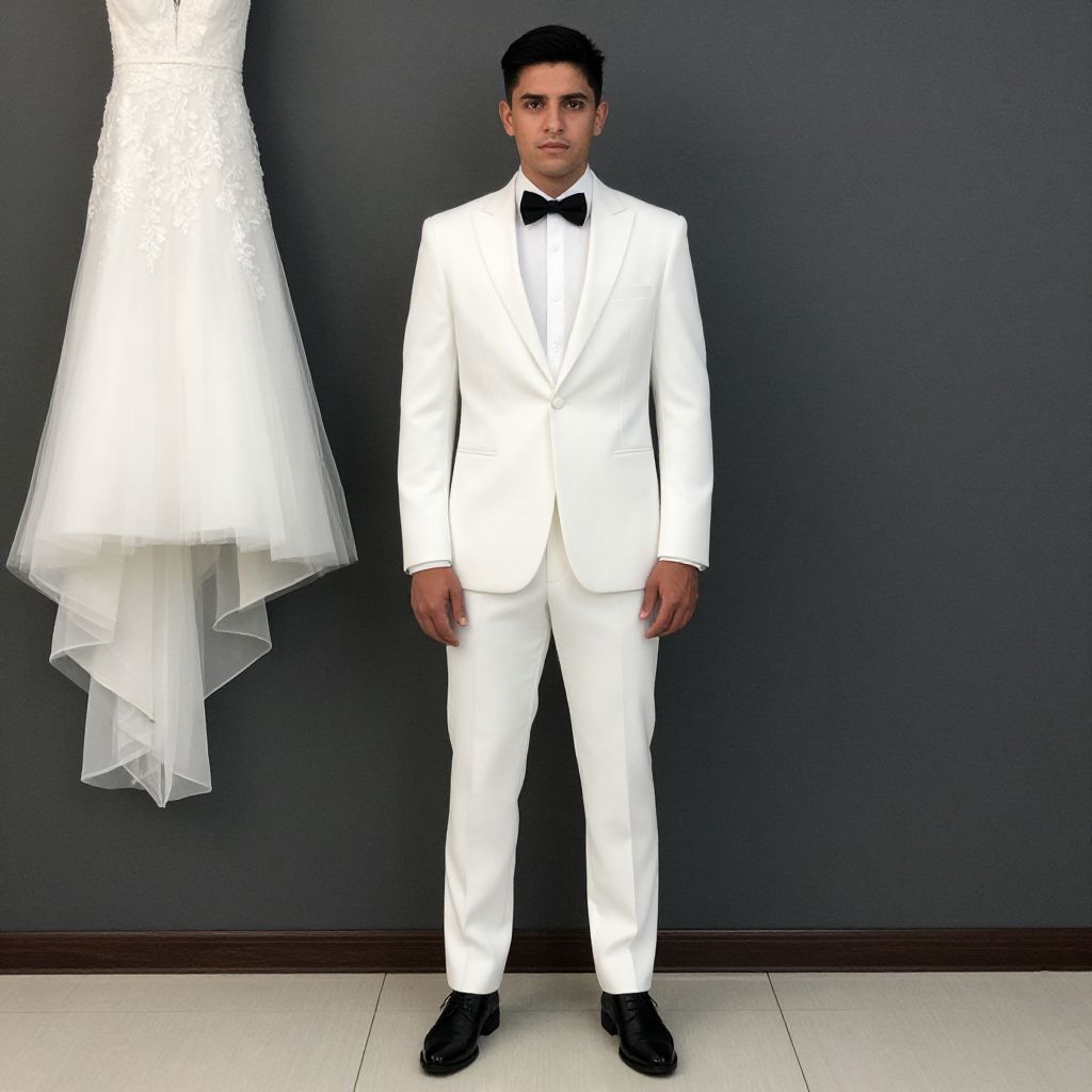 "Wedding Dress Suit, man in a white suit and tie standing in front of a wall"