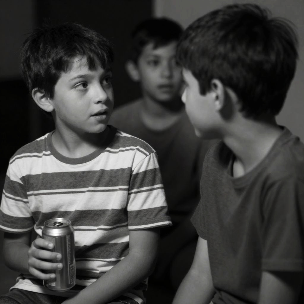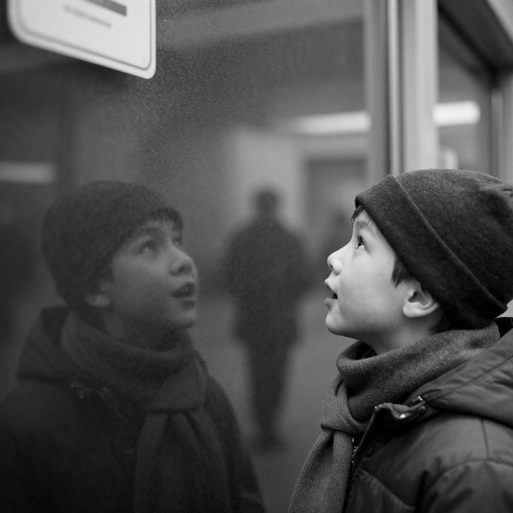 Black-and-white photograph of a young boy in a hat and scarf, looking up at a large, reflective, ured surface with sparkling details. His profile is visible, mouth slightly open. The surface has a label in the top left. The boy is on the right, surface on the left. Two people are visible, one reflected.