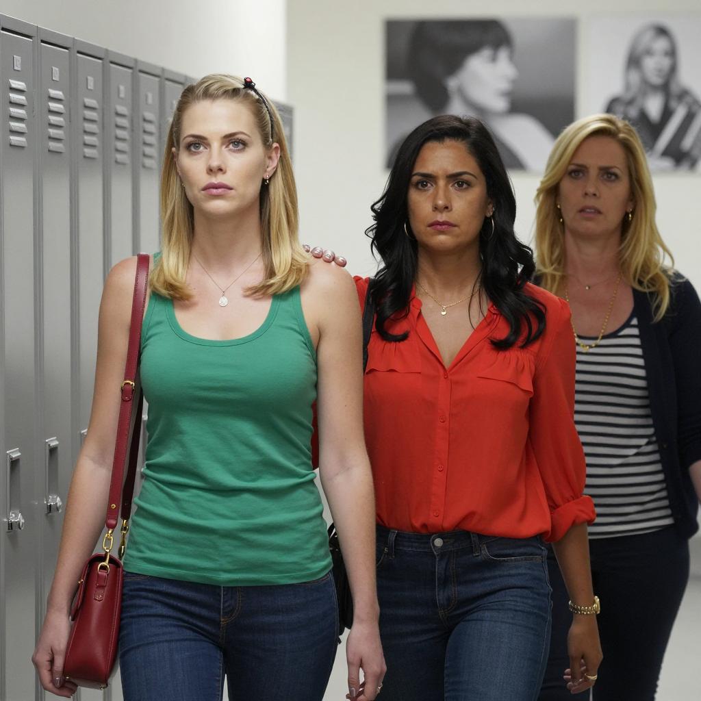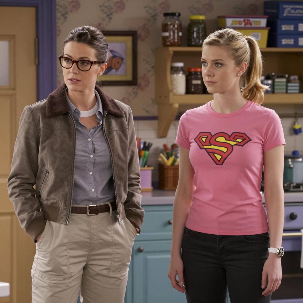 Two women stand in a vintage-style kitchen. The woman on the left wears glasses, a brown jacket with a shearling collar, a gray button-up shirt, and beige pants with her hands in her pockets. The woman on the right has blonde hair tied in a ponytail and wears a pink t-shirt featuring a yellow and red superhero emblem, along with black pants and a white watch. The kitchen features light blue cabinets, patterned wallpaper, a wooden shelf with jars and boxes, and various kitchen utensils in the background.