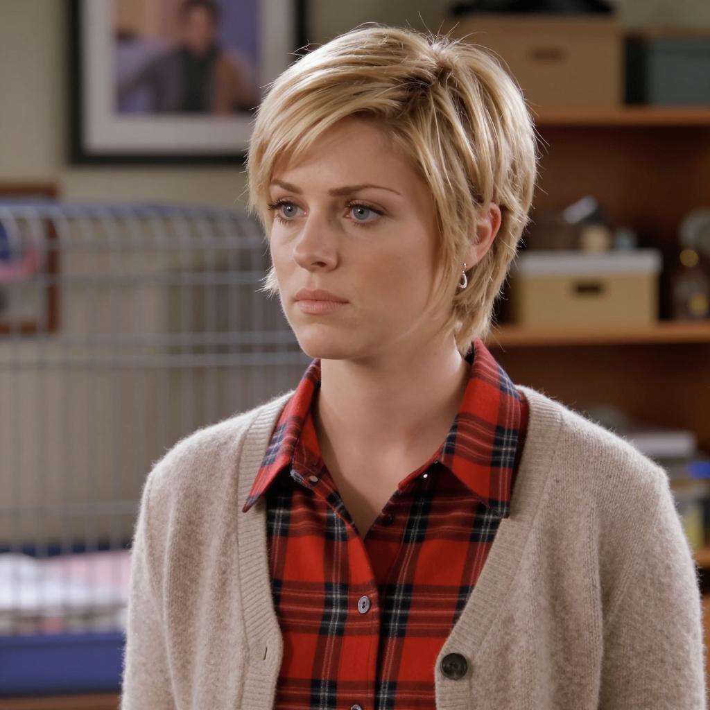Two women in a vintage-style kitchen. Woman on left, wearing glasses, brown jacket, gray shirt, beige pants, standing with hands in pockets. Woman on right, blonde hair in ponytail, pink "Wonder Girl" t-shirt, black pants, looking to the side. Patterned wallpaper, framed picture, shelves with jars and boxes in background.
