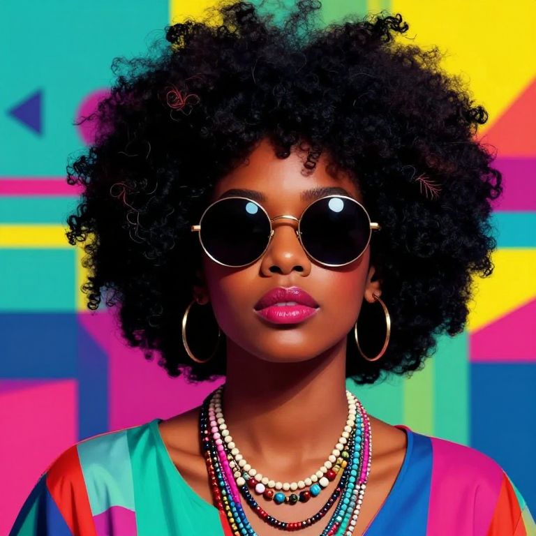 Photograph of a Black woman with a medium-dark skin tone, wearing large, round, black sunglasses, and a colorful, tie-dye shirt. She has a voluminous, natural afro hairstyle and sports large hoop earrings and multiple layered necklaces with beads in various colors. Her lips are painted a glossy pink. The background is a vibrant, abstract mix of bright yellow, pink, blue, and green geometric shapes, adding a modern, retro-futuristic feel to the image. The woman's confident expression and stylish attire make her the focal point of the photograph.
