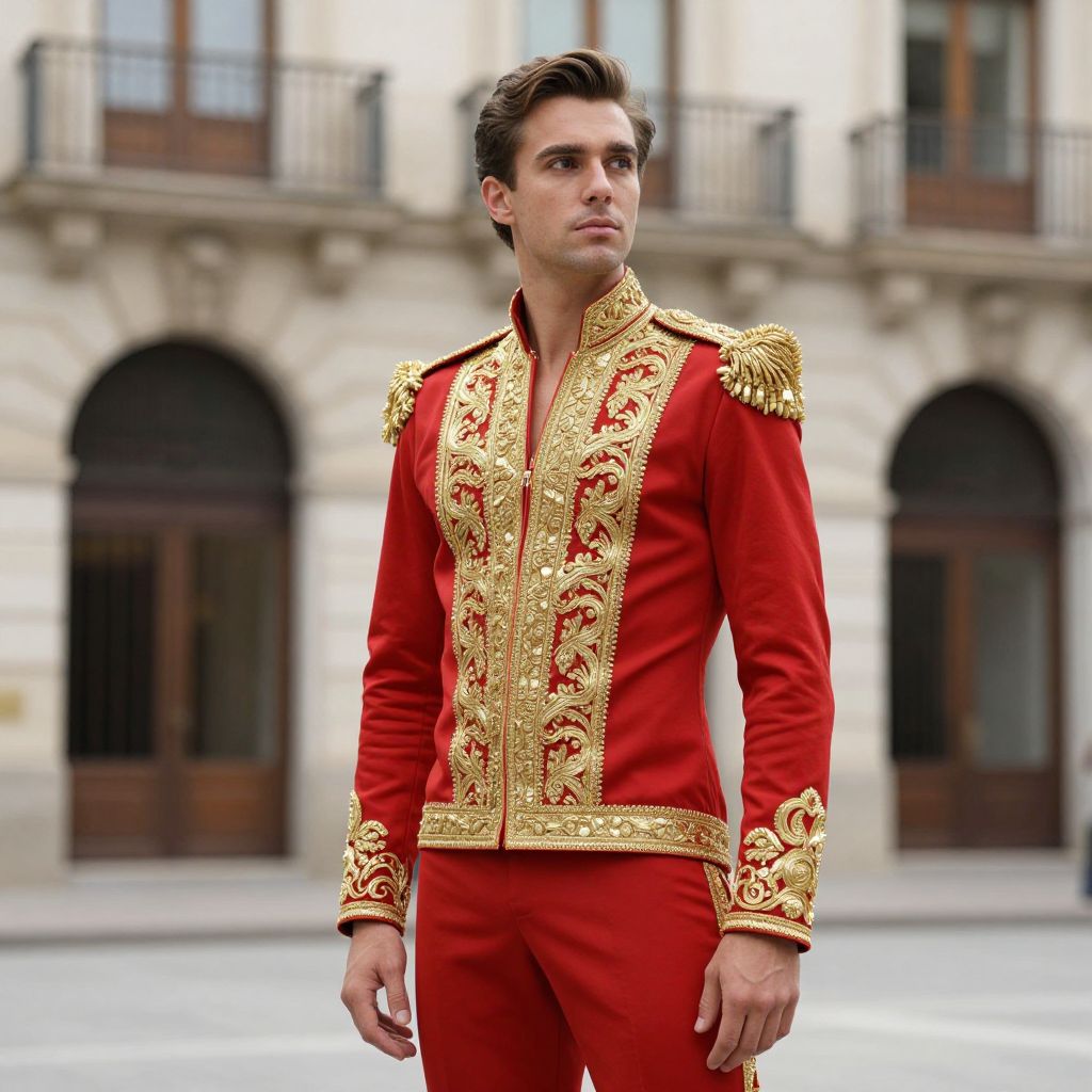 Spanish Male Dress, man in a red and gold outfit standing in front of a building