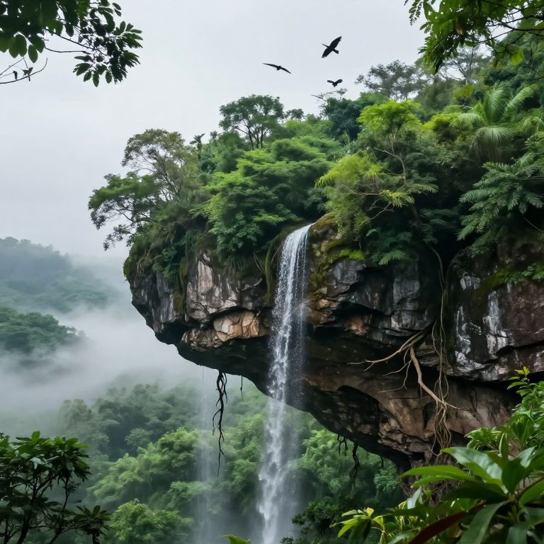 Photograph of a lush tropical waterfall cascading from a rocky cliff covered in dense green foliage, surrounded by misty forest.