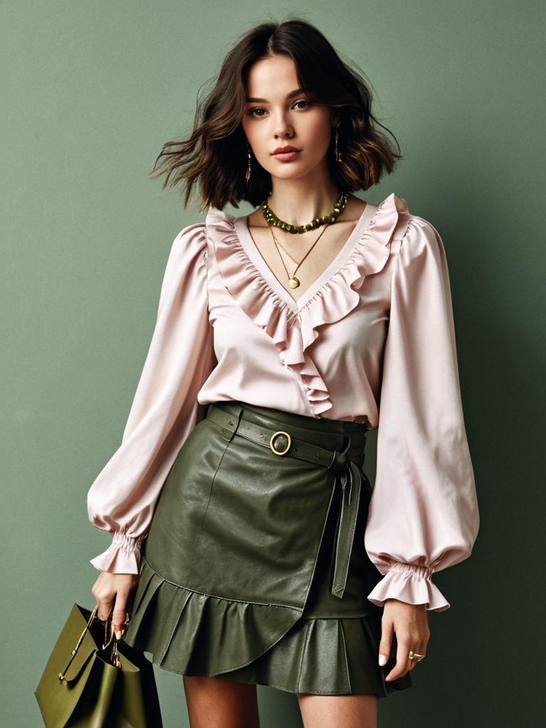Woman, trendy fashion, metallic silver halter-neck tank top, pleated midi skirt, leather-like material, thin layered gold necklaces.