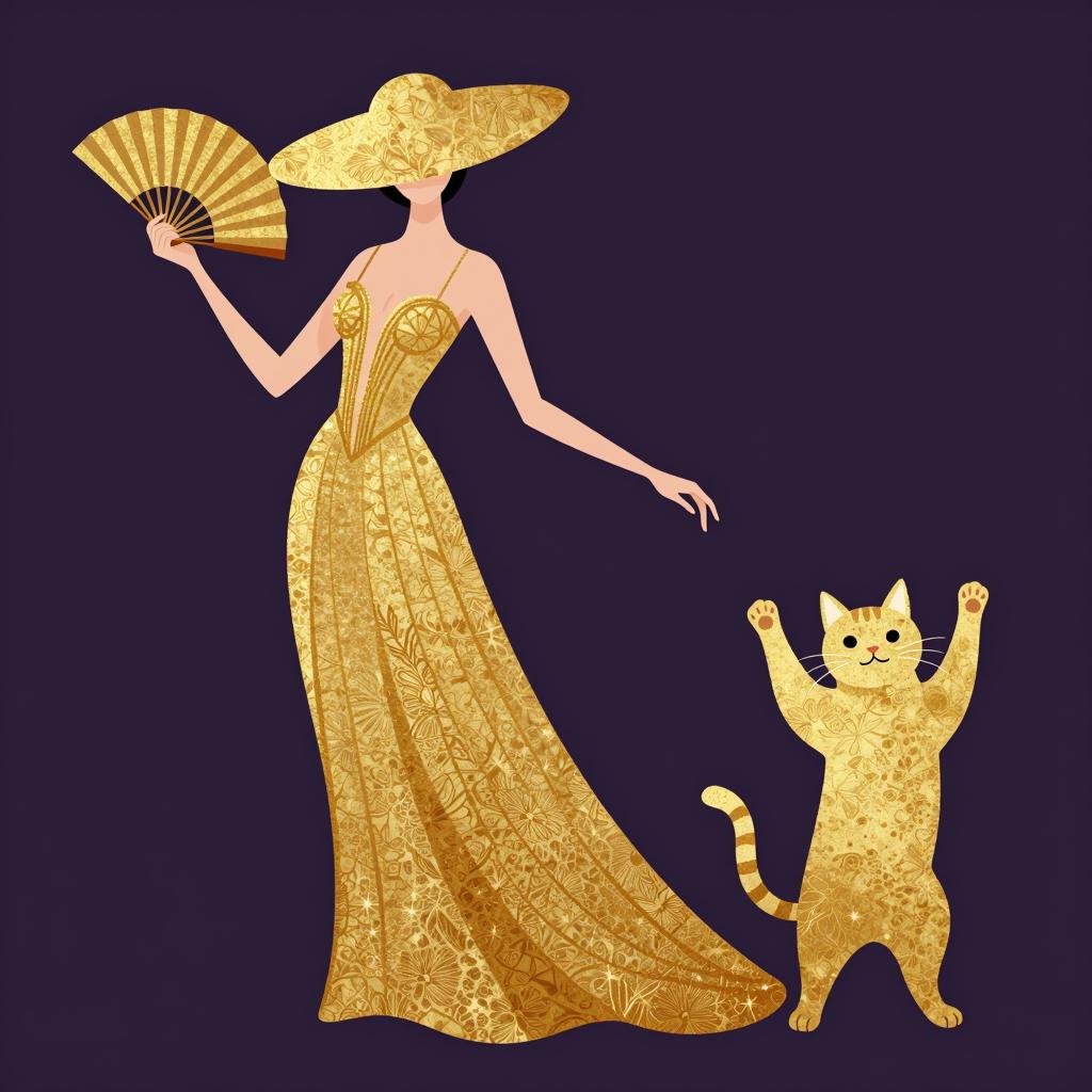 Illustration of a woman in a flowing, golden dress with a wide-brimmed hat, extended arm, and fan. She stands on the left, golden lines forming her dress and hat. A standing cat with raised paws is on the right. Background is dark purple. Woman's face not visible. Artist's in the bottom left corner.