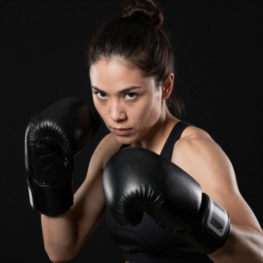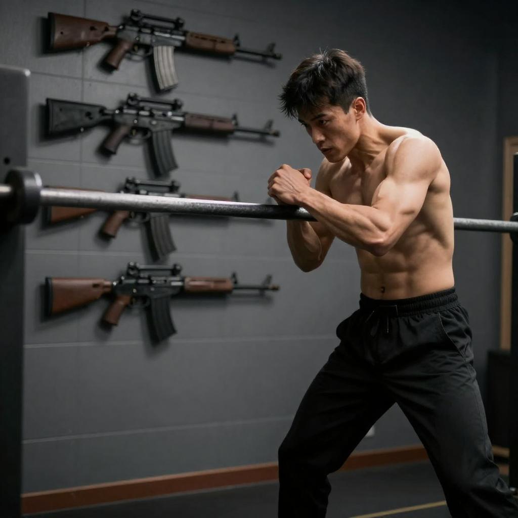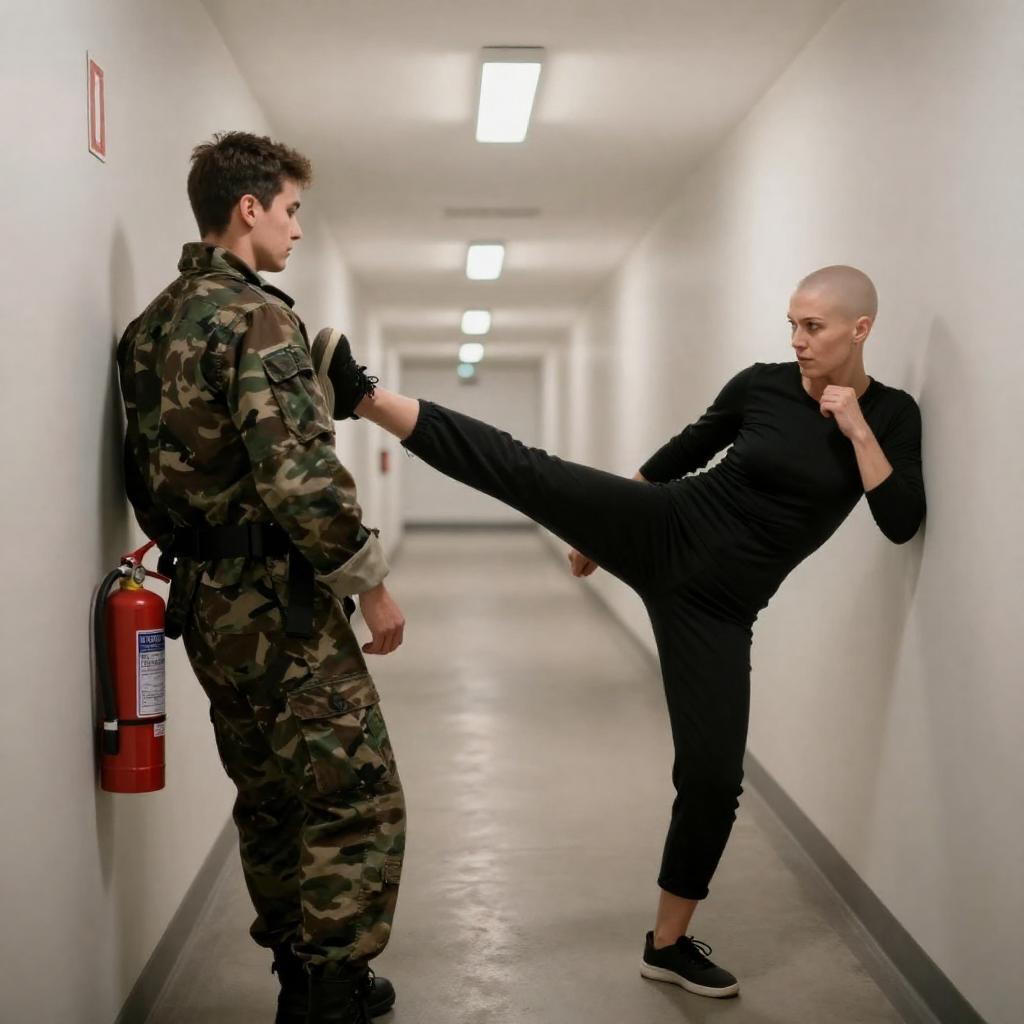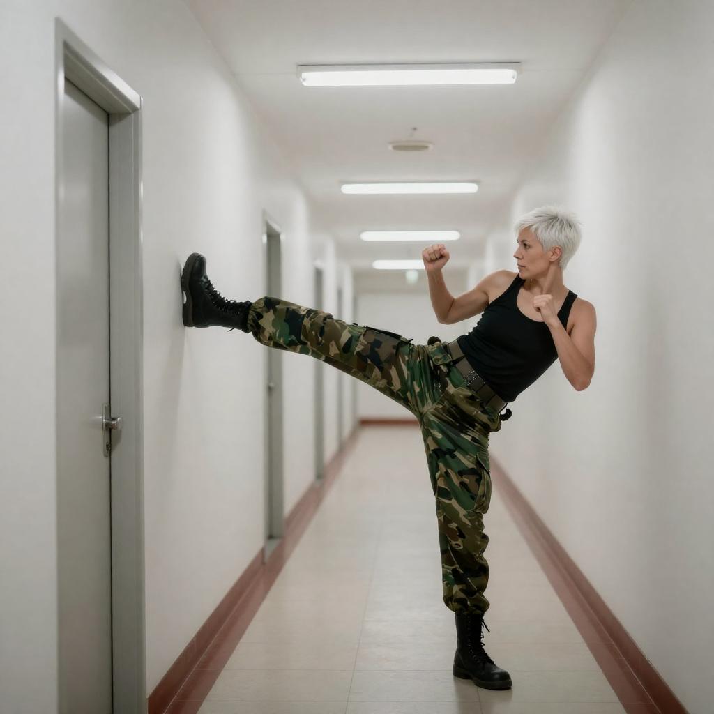 Photograph of a hallway. A woman with short white hair, black tank top, and black pants kicks a man in green camouflage uniform against the wall. She is mid-kick, with fists raised. He is facing the wall, hands up. Hallway has white walls, fluorescent lights, and red-striped floor.