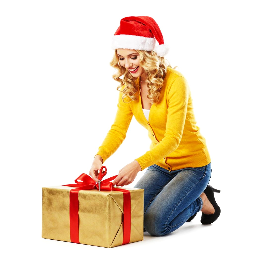 A colorful photograph of a smiling blonde woman with a red and white Santa hat, wearing a yellow cardigan and blue jeans, kneeling and opening a large gold gift box with a red ribbon. She's holding a red scissors in her right hand. The background is plain white, making the vibrant colors pop. The image has a playful, festive vibe.