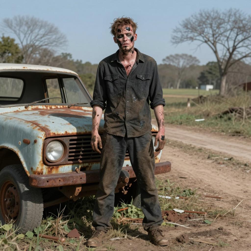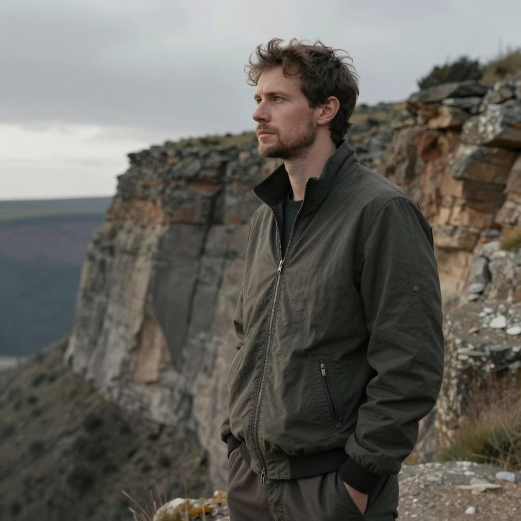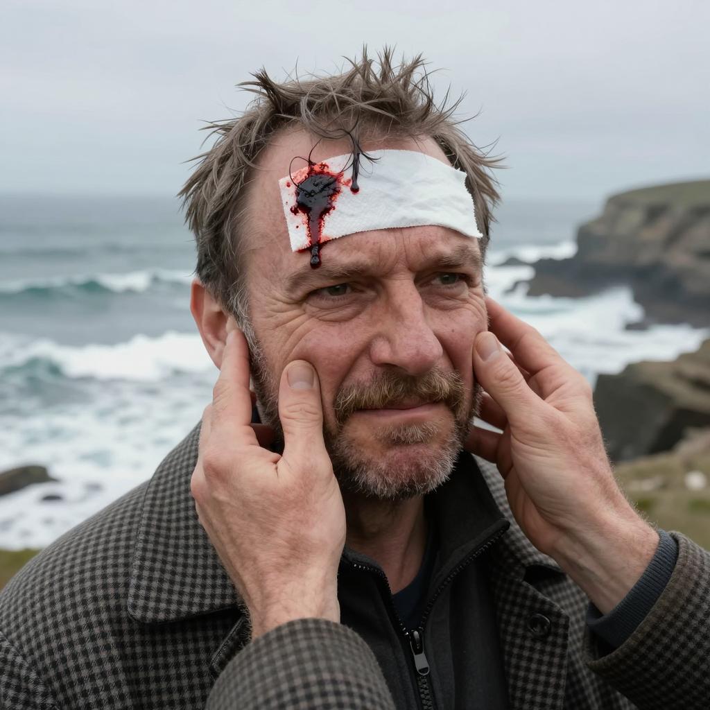 Middle-aged man with a bloody bandage on his forehead, mustache, and short hair, being held by two hands on either side of his face. He has a grimacing expression. Background: ocean with waves and rocky cliffs. Overcast sky. He wears a checkered coat.