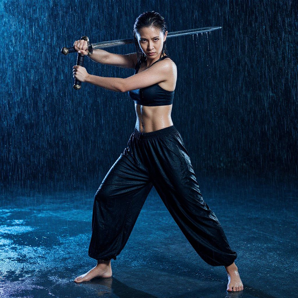A dramatic photograph of a fierce, dark-skinned woman with braided hair, standing in a rainstorm. She's in a fighting stance, gripping a sword with both hands. She's wearing a dark blue sports bra and loose, baggy pants, barefoot on a wet, reflective floor. The background is dark and blurred, emphasizing the intense blue lighting and rain. Her expression is determined and focused.