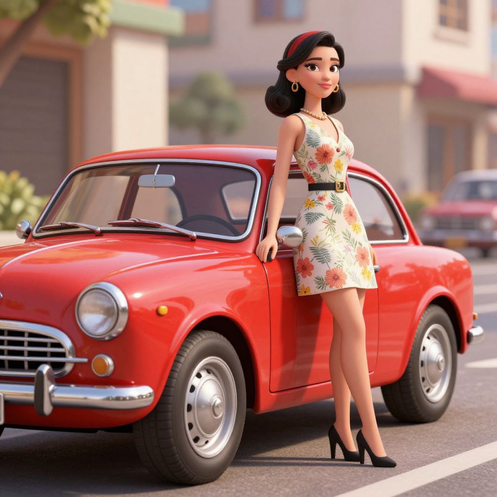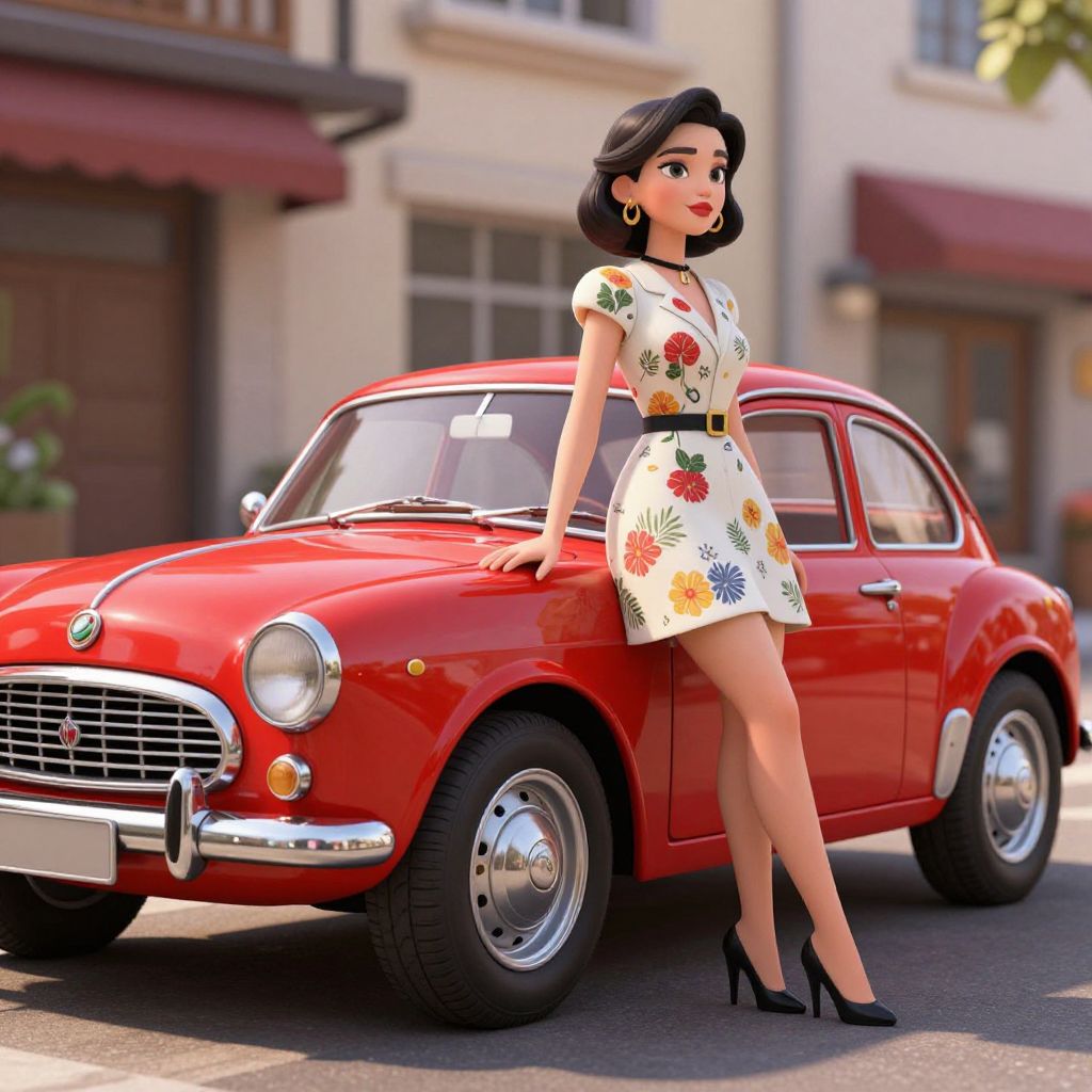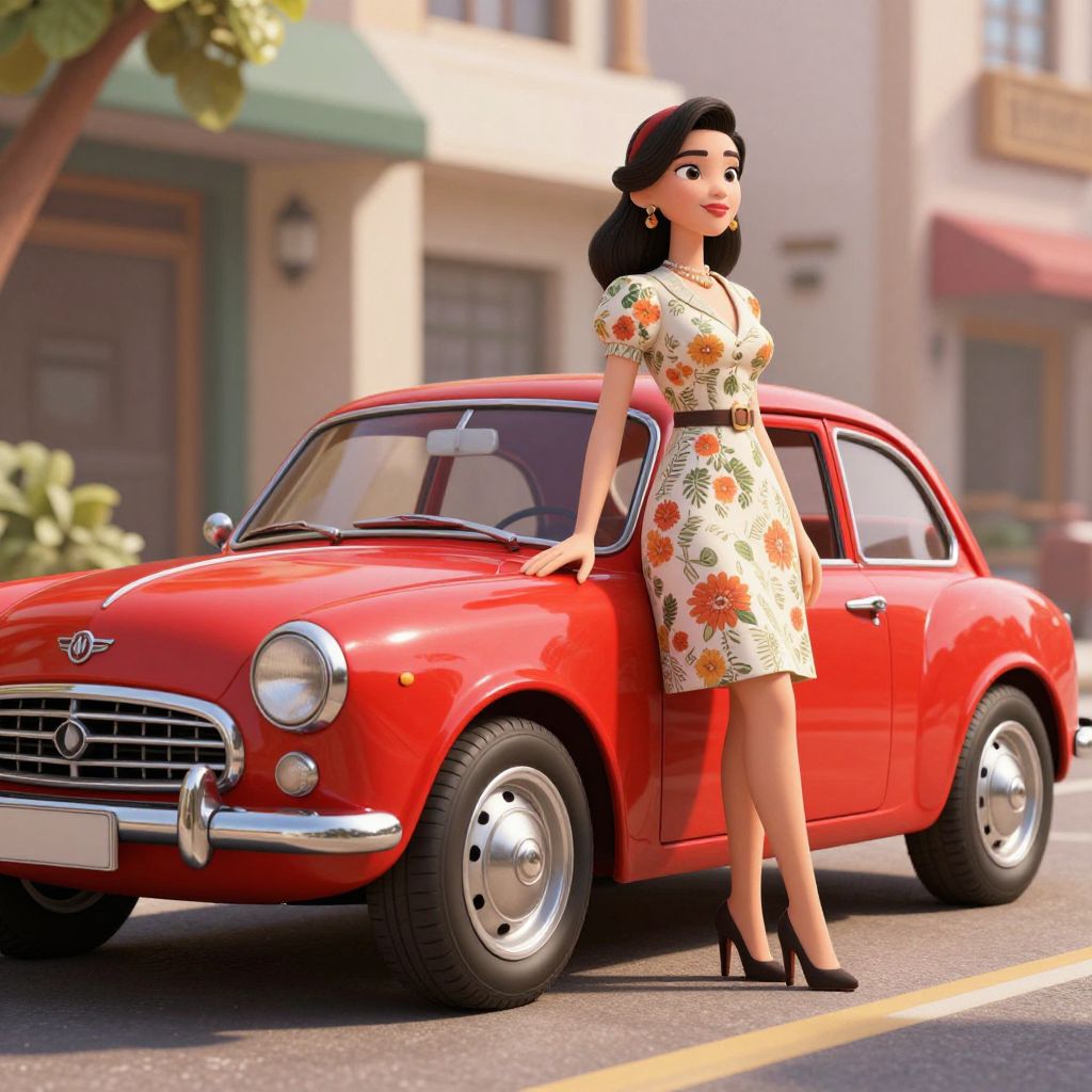 A high-definition, retro-inspired 3D render featuring a classic red vintage car parked alongside a stylishly dressed woman in a floral dress, set against a sunlit urban backdrop with dramatic lighting effects, evoking a nostalgic and cinematic aesthetic ideal for desktop wallpapers.