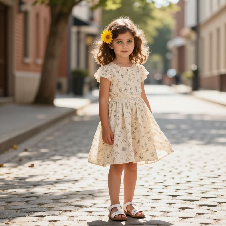 A young girl with soft, curly brown hair and bright green eyes is standing on a cobblestone street, a vibrant yellow daisy tucked neatly in her hair. She wears a cream-colored dress with a delicate floral pattern, the fabric gently flowing in the breeze, and pairs of white lace-up sandals on her feet. The street is lined with old brick buildings and sunlight filters through the trees, casting soft shadows on the stones. The scene is warm and inviting, capturing a moment of quiet joy and innocence in a picturesque, slightly nostalgic urban setting.