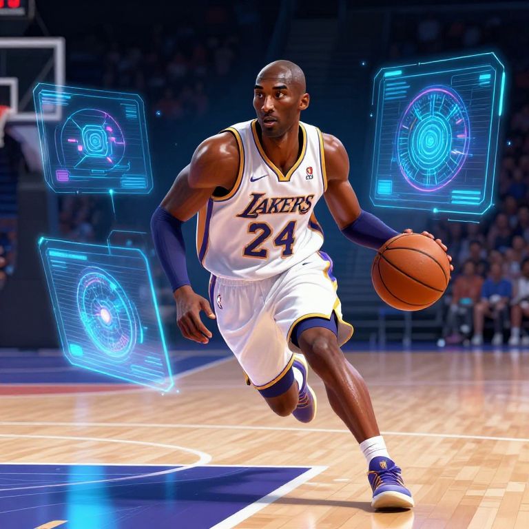 Kobe and AI wallpaper depicting an animated scene where a basketball player powered by AI enhancements dribbles on a digital court, with holographic displays and abstract machine learning symbols blending into a seamless futuristic sports design.