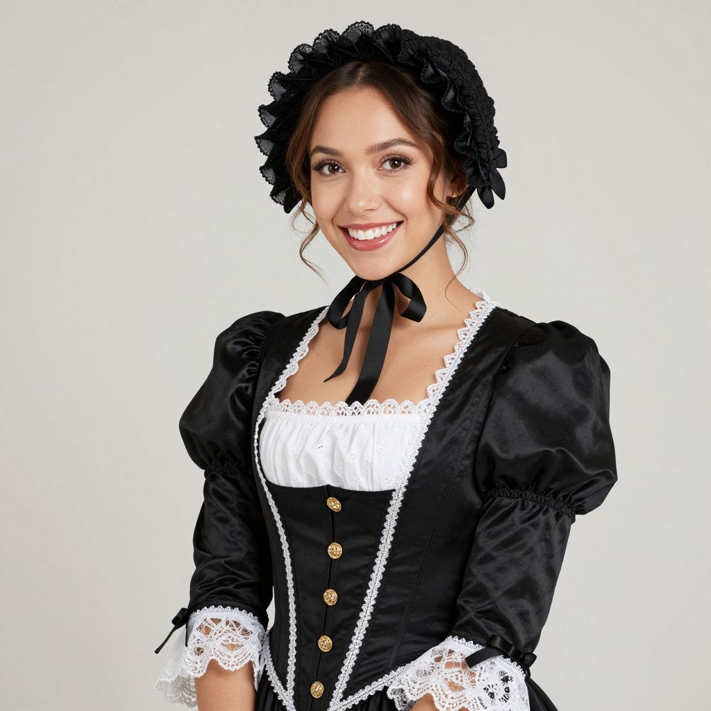 Woman wearing a Victorian-style costume featuring a black satin dress with white lace trim, a fitted corset with gold buttons, and a matching bonnet with ruffled edges, smiling warmly against a plain background.
