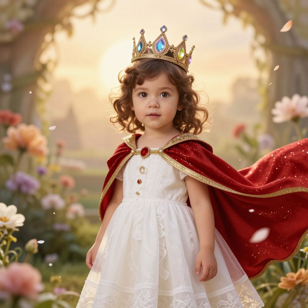 A young child with soft, curly brown hair and bright, curious eyes stands in a magical garden, wearing a pristine white dress with delicate lace trim, adorned with a shimmering red and gold cape that flows gently in the breeze. The child wears a small, ornate crown made of sparkling gemstones and golden filigree, symbolizing royal grace and innocence. The background features blooming flowers, floating petals, and a warm golden sunrise, creating a whimsical and enchanting atmosphere.