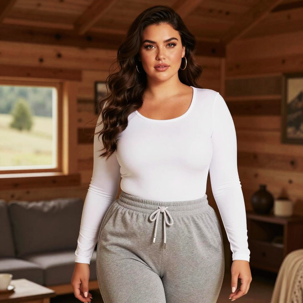 A Plus-size woman in a casual chic outfit, wearing a fitted white top and heather grey joggers, stands in a cozy mountain cabin, styled in the visual aesthetic of One Piece. She has neutral makeup with highlighted cheekbones and long wavy hair. Sexy. Pretty face and beutiful eyes