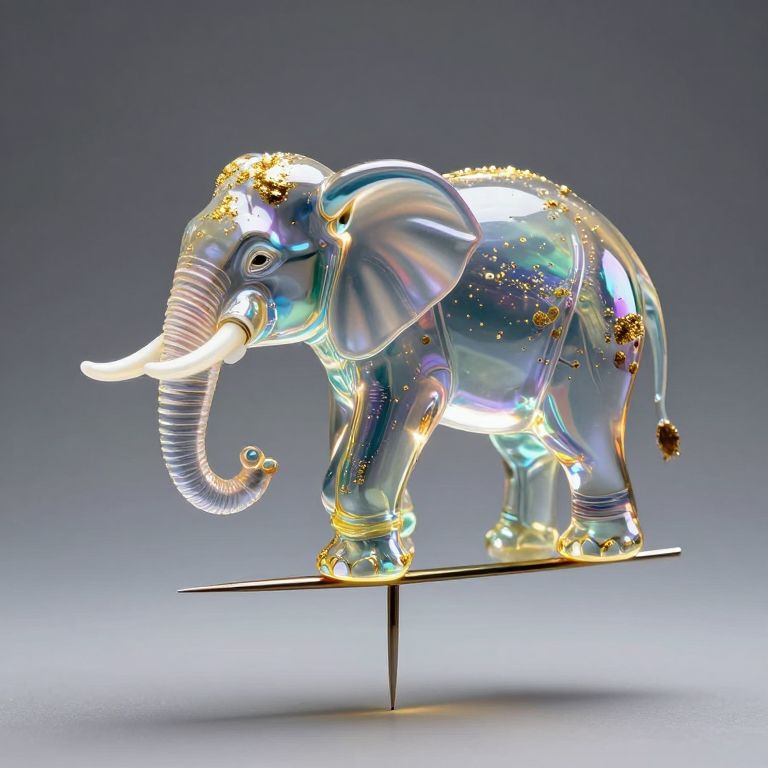 A luminous elephant crafted from iridescent glass, adorned with golden flecks, defies gravity by balancing gracefully on a slender needle, its translucent body shimmering with otherworldly hues.