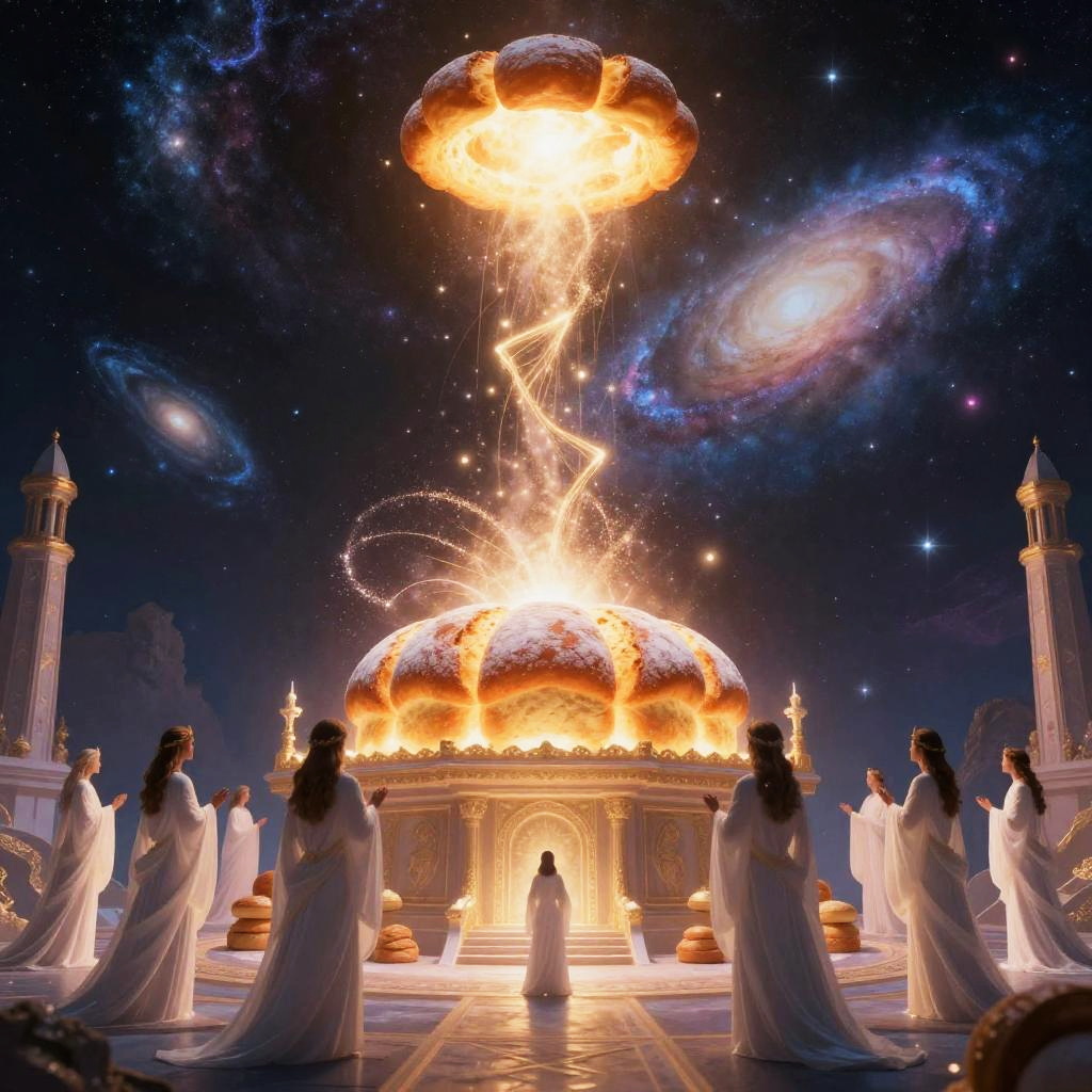 Miraculous celestial bread resting on a vintage wooden table on a floating asteroid, cosmic energy beams and auroras in the background, fantasy space setting