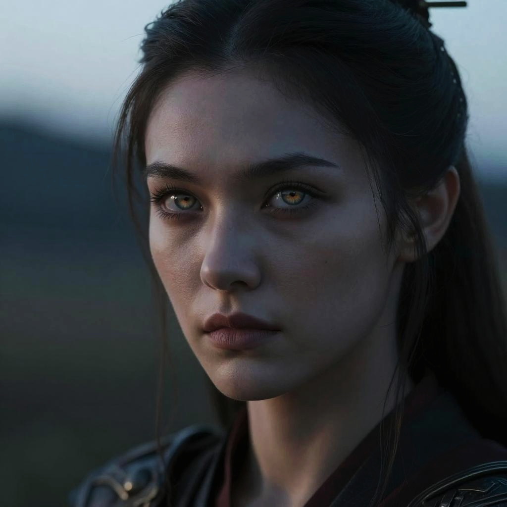 Intense negative canthal tilt hunter eyes glowing subtly, mythical hunter in twilight, strong jawline, high contrast natural lighting, photo-realistic style with fantasy elements