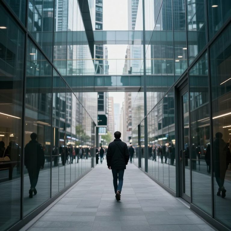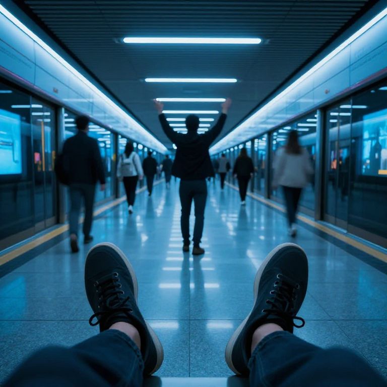 Feet out of frame in a futuristic subway station, glowing blue panels, people moving in corridors, one individual standing with arms raised, only upper body visible, neon reflections, cyberpunk aesthetic, high detail, cinematic lighting.