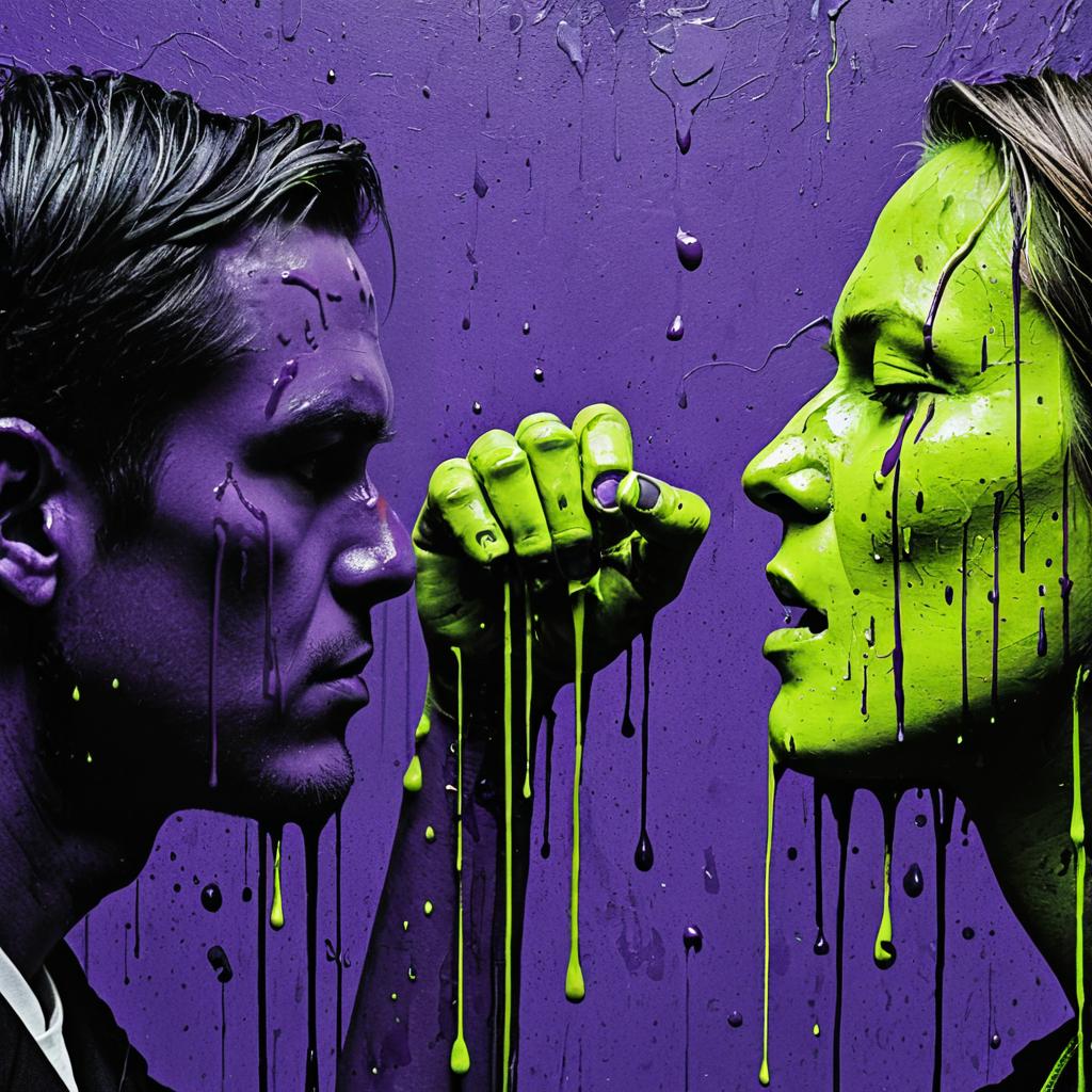 Artistic close-up of two faces painted in contrasting colors—purple and lime green—facing each other with intense expressions. The image features dripping paint on textured purple background, illustrating a symbolic psychological conflict or inner conscience battle in a surreal, gesture-driven style with flattened 3D perspective.
