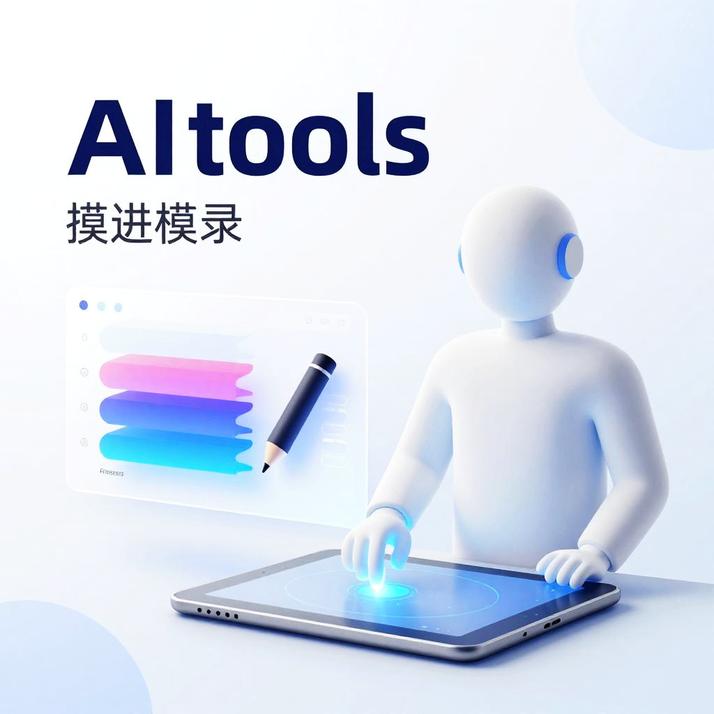 Illustrator AI tools represented by a glowing AI assistant guiding an artist's hand on a digital tablet, with floating UI elements like layers and pen tools, in a bright, clean interface environment filled with soft gradients and futuristic typography.