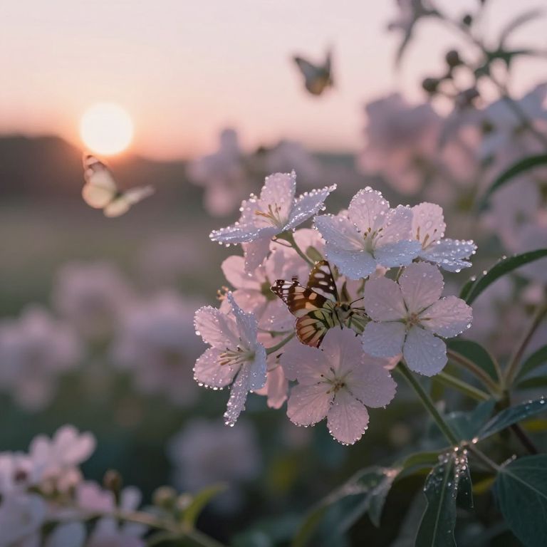 Wiltering flowers in a garden at dusk, petals gently drooping with dew drops, soft pastel colors blending with fading sunlight, delicate butterflies hovering nearby, intricate botanical details, dreamy and tranquil mood