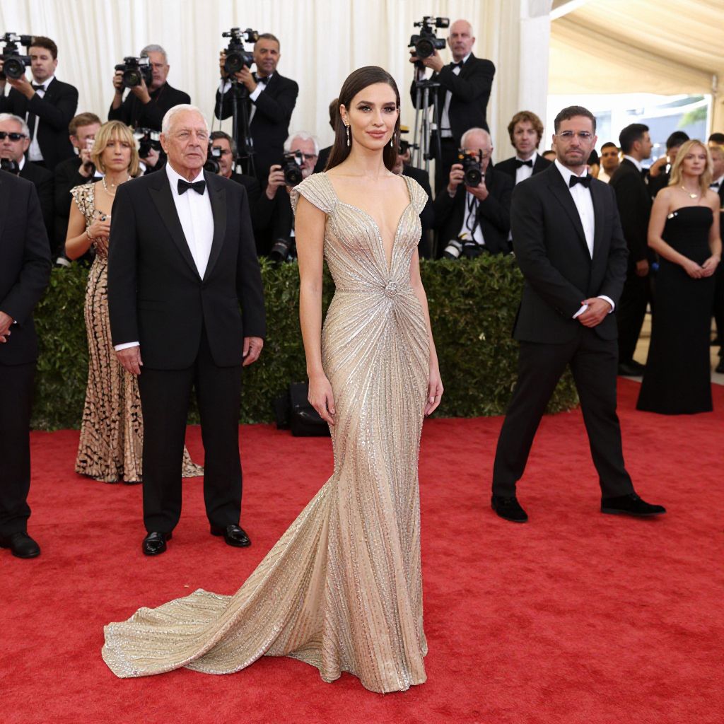 Elegantly dressed attendees gather on the red carpet at the Met Gala, featuring a woman in a shimmering gold gown with intricate detailing, surrounded by photographers and formally dressed guests in tuxedos.