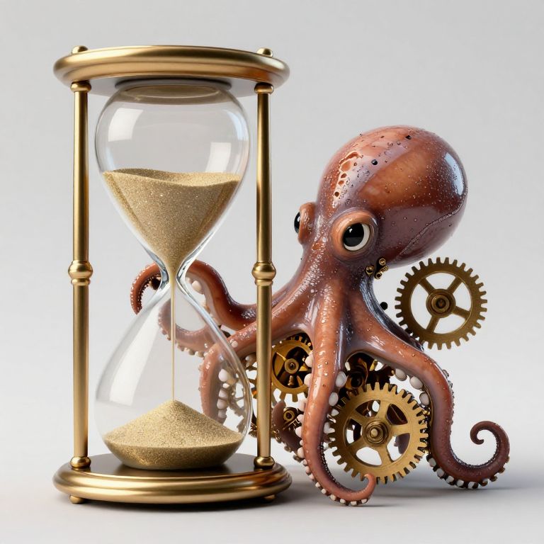 Photorealistic CGI of a shiny brown octopus with gears on its arms, next to a golden hourglass with brass columns.