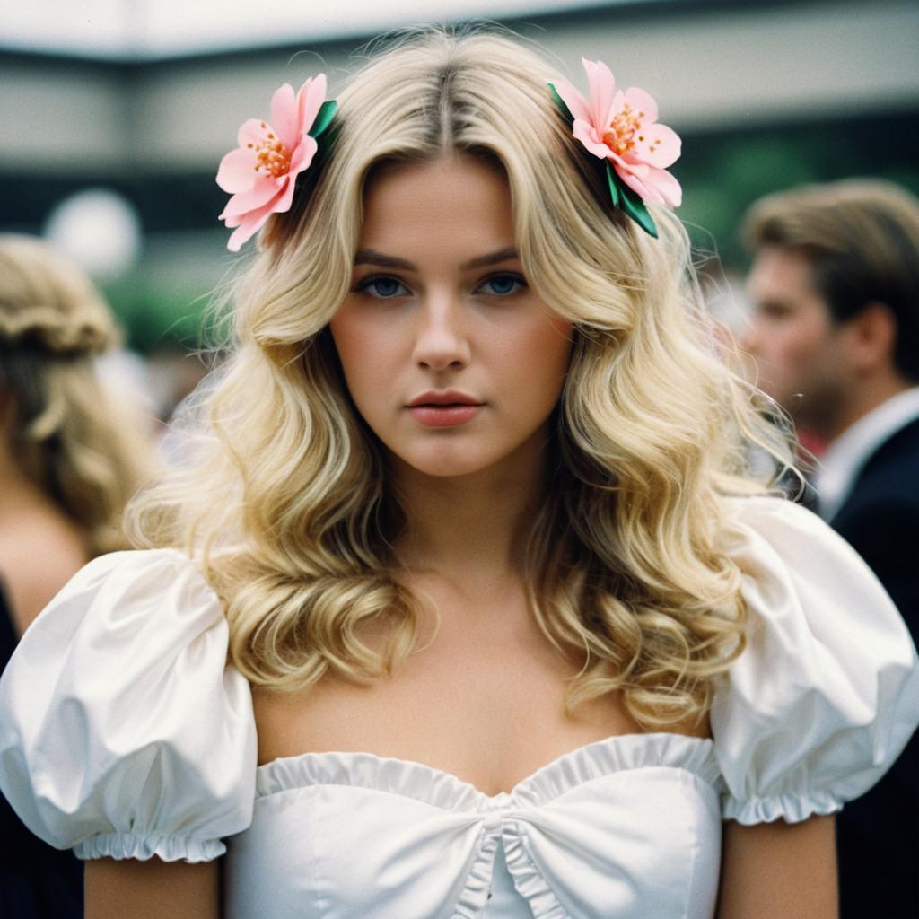 Blonde Woman with Daisy Hair Ornament at Night Party