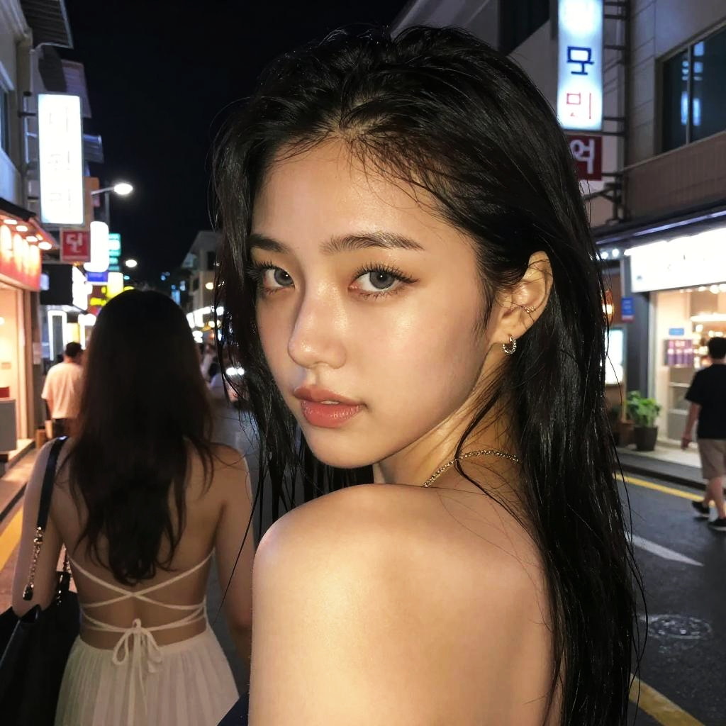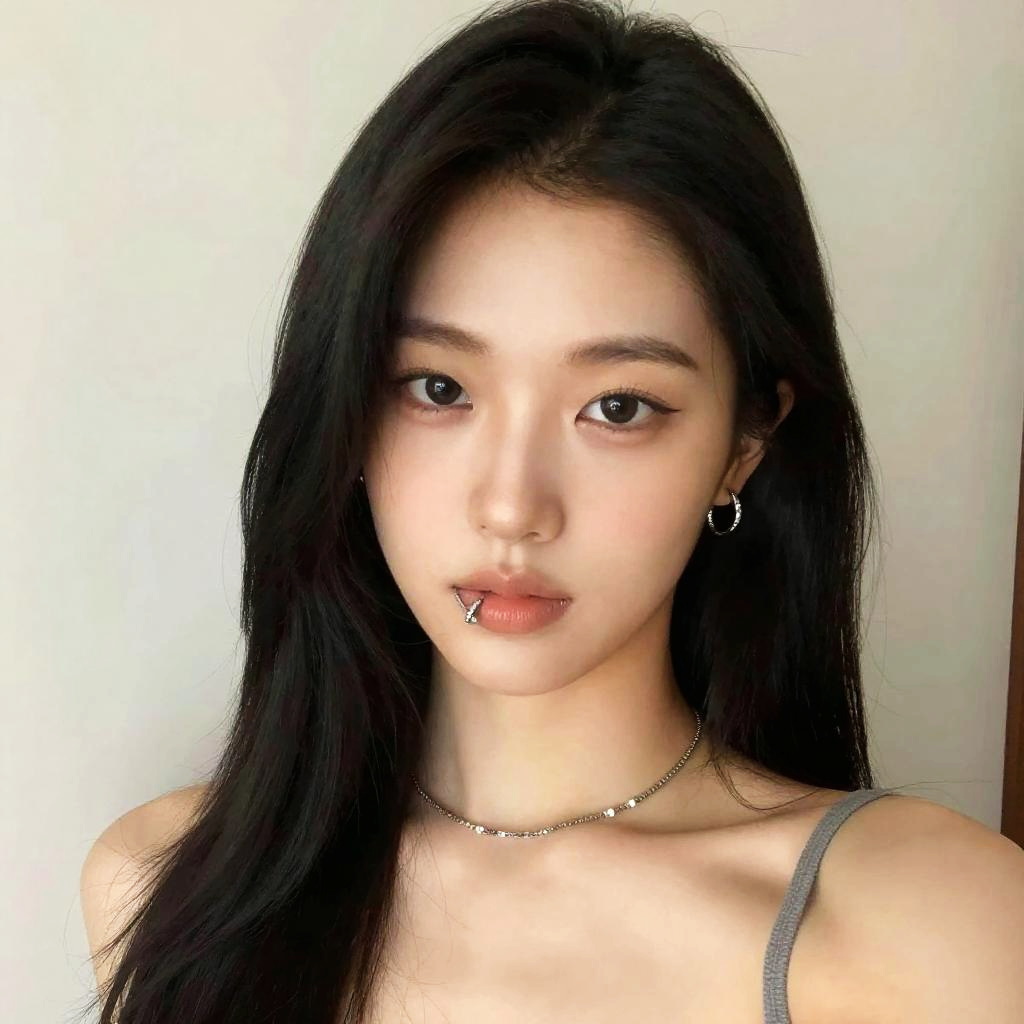 Realistic, young Japanese idol 1girl portrait, upper body, black hair, indoors, looking at viewer, simple background, parted lips, jewelry including a necklace and earrings, popular Korean makeup, photorealistic