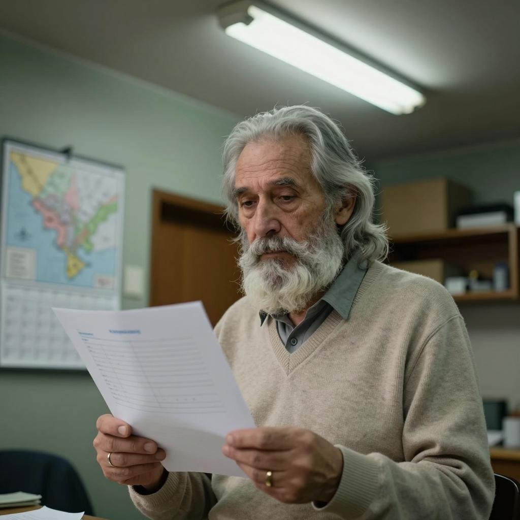 An elderly man with long gray hair and a full beard is reading a white document with blue markings. He is wearing a beige V-neck sweater over a gray collared shirt. The setting is a dimly lit room with green walls, a fluorescent overhead light, a wall calendar with a colorful map, and a cluttered bookshelf in the background. The man’s expression is focused and thoughtful.