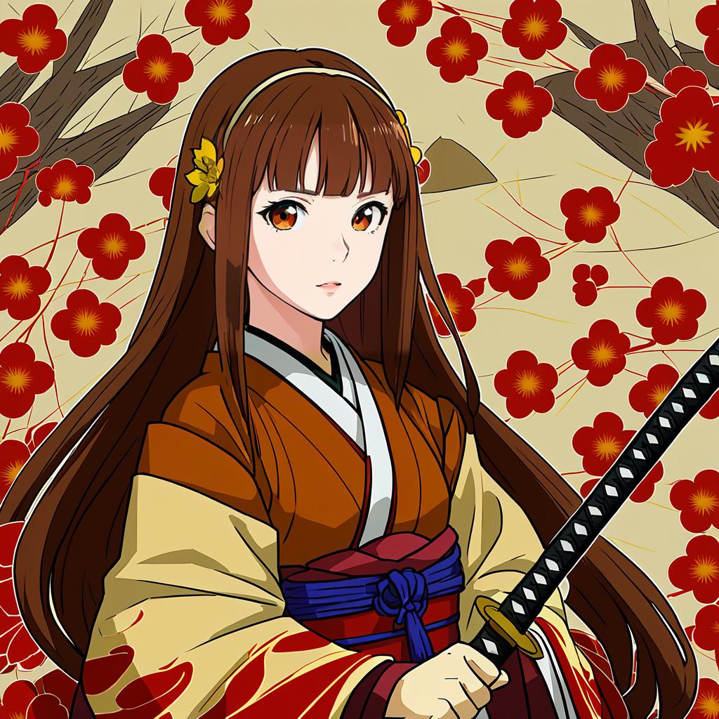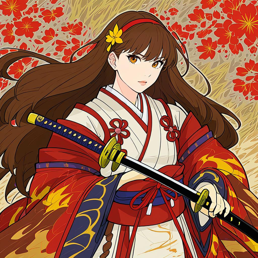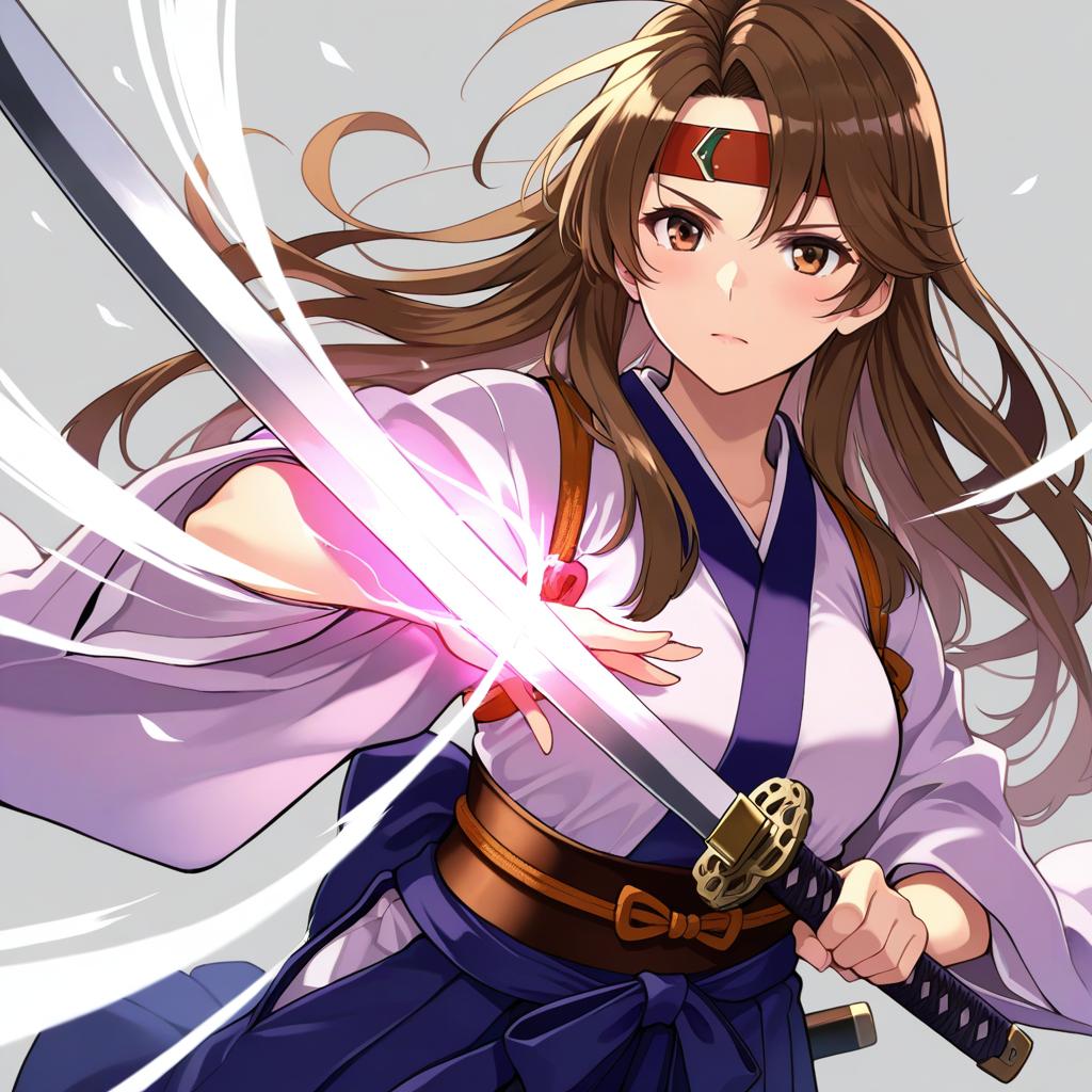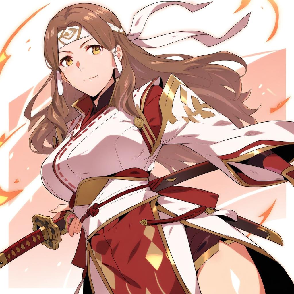 Hana (fire emblem), fire emblem, 1girl, brown eyes, brown hair, long hair, japanese clothes, katana, headband, by artist ui frara, leet