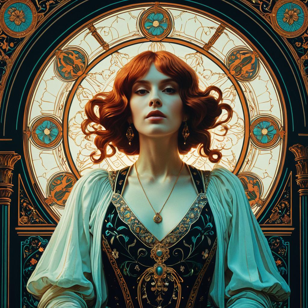 Hyperrealistic portrait of a woman with red wavy hair wearing an ornate, vintage baroque dress with intricate gold and turquoise embroidery. The background features a circular stained-glass inspired design with floral and ornate patterns, creating a rich, elegant, and atmospheric setting. The image combines elements of classic art nouveau and dark mysticism with sharp focus and vibrant, radiant lighting.