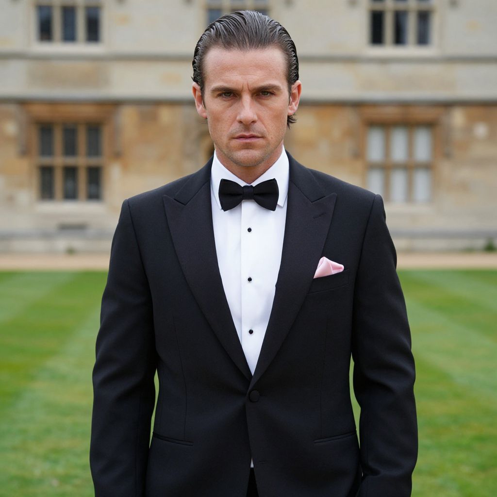 Tall handsome men in elegant formal attire posing in front of a vintage car, classic 1950s style, black and white photography, sharp features, moody dramatic lighting