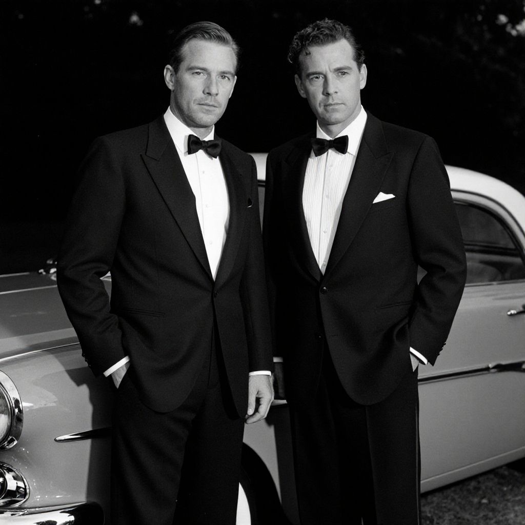 Photograph in black-and-white of two Caucasian men standing side by side, both wearing formal black tuxedos with white dress shirts and black bow ties. The man on the left has short, slicked-back hair and his hands are in his trouser pockets, while the man on the right has slightly wavy, combed-back hair and his hands are relaxed by his sides. Both have a serious expression. Behind them, a classic, chrome-accented car is partially visible, with its shiny surface reflecting light. The background is dark, emphasizing the subjects and the car. The image has a high contrast, giving a dramatic, vintage feel.