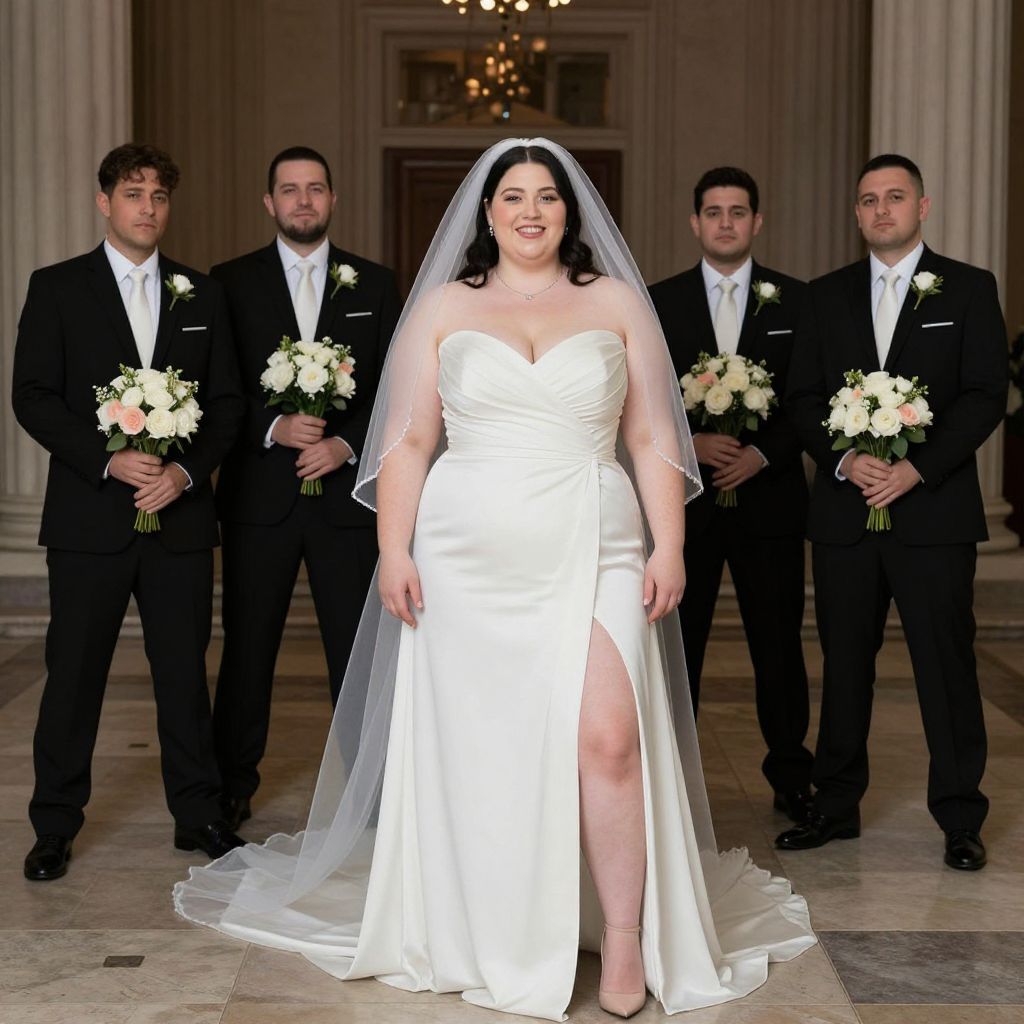 Photograph of a plus-size bride with pale skin, dark wavy hair, and red lipstick, wearing a strapless white satin gown with a thigh-high slit and a sheer veil. She stands confidently in the center, flanked by four tall, slim, bearded men in black suits, white shirts, and ties, each holding a bouquet of white and pink flowers. The background features a grand, dimly lit hall with tall columns and a chandelier. The floor is a polished marble. The bride's dress contrasts with the dark suits of the men, creating a striking visual balance.