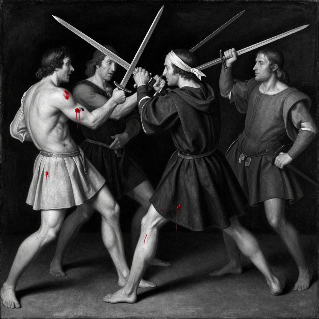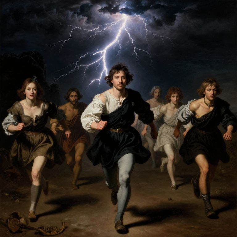 Spandex people running towards the camera from different eras. dramatic lightning Caravaggio , beksinski,