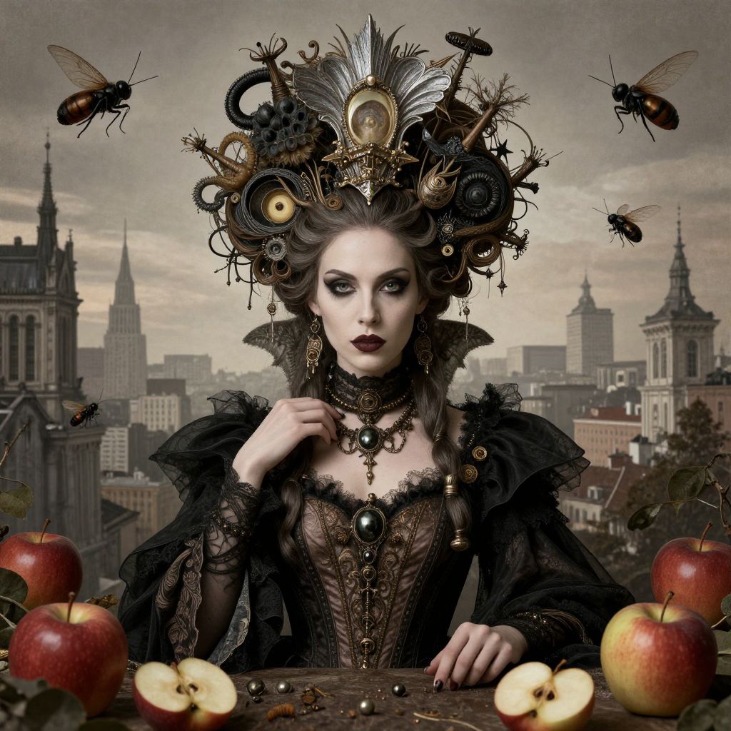 A digital art piece featuring a pale-skinned, dark-haired woman with striking blue eyes and dark lipstick, adorned in an elaborate, steampunk-inspired black lace dress with intricate gold and black mechanical accessories. She wears an ornate, oversized headpiece filled with gears, feathers, and eyes, surrounded by hovering bees. The background showcases a gray, overcast cityscape with Gothic-style buildings. In the foreground, several red and yellow apples and apple slices are scattered on a wooden surface. The overall style combines Victorian elegance with steampunk and surreal elements. The woman's intense gaze and elaborate attire create a mysterious, almost otherworldly atmosphere.