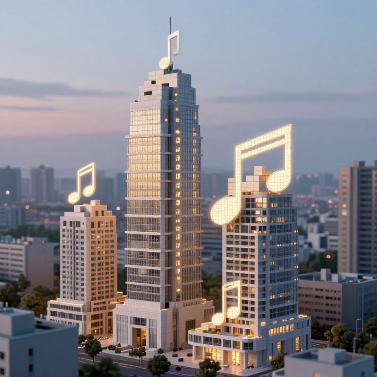 Photograph of a modern cityscape at dusk, featuring illuminated, music note-shaped lights on tall glass skyscrapers, against a softly lit, blue