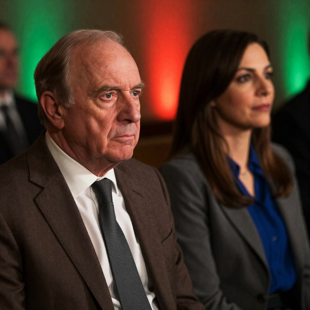 Photograph of an older man and a woman standing side by side. The man has short gray hair, wears a black suit with a white shirt and maroon tie, gesturing with his right hand. The woman has brown hair with bangs, wears a black blazer over a deep red top, and large hoop earrings. Both have neutral expressions. Background features dark, ured wall with multicolored lights. Both are slightly smiling. Man on left, woman on right.
