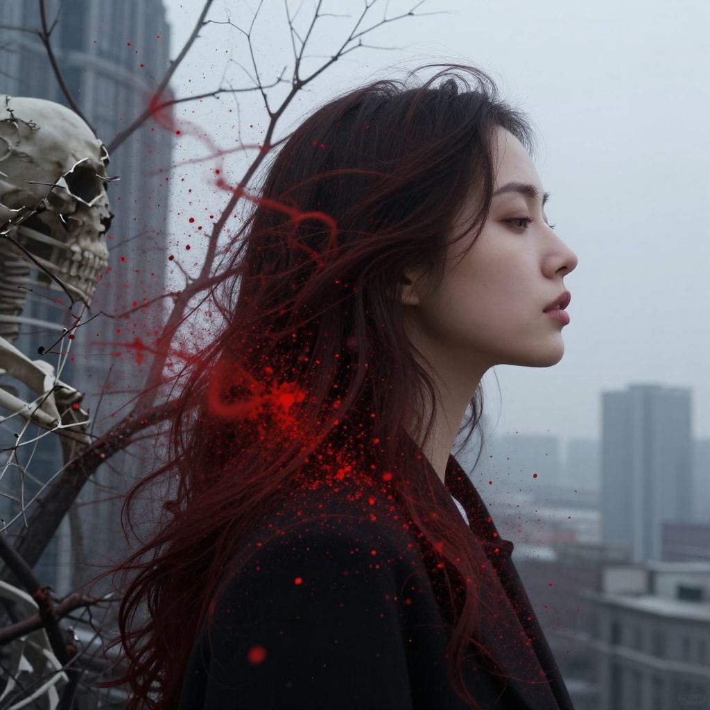 A hauntingly serene profile of a woman dissolves into a cascade of red sparks and splatters, merging seamlessly with skeletal branches and a looming cityscape, where reality fractures into an abstract tapestry of emotion and decay.