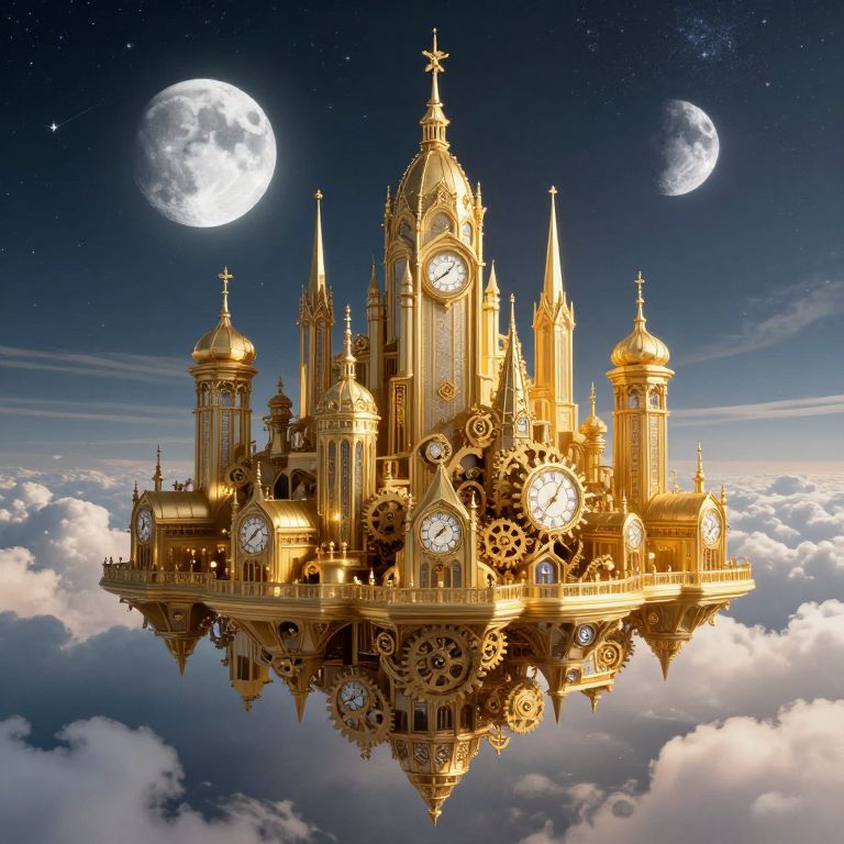 A majestic, golden city of impossible architecture floats serenely among the clouds, its spires and turrets adorned with countless clocks and gears, all mirroring the celestial dance of the moon and stars above.