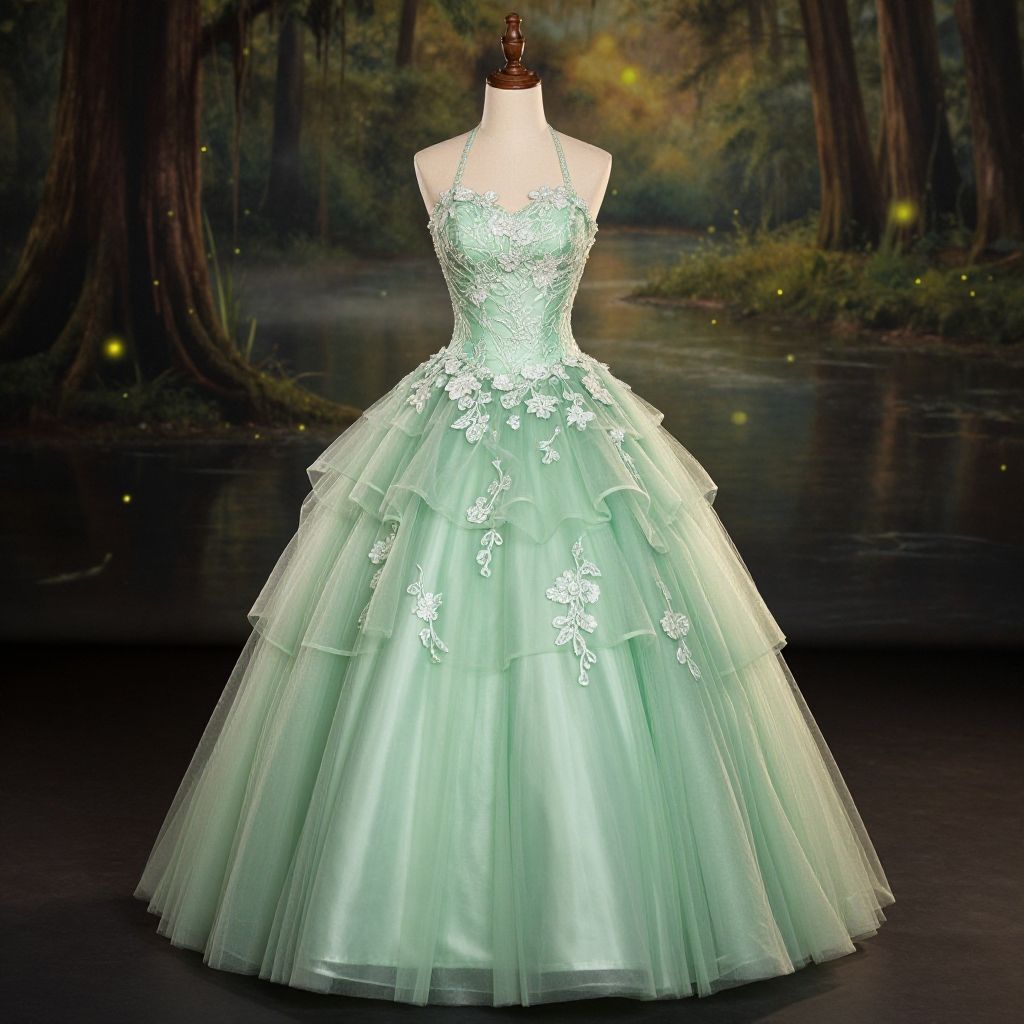 Photograph of a blue satin bodice with puffed sleeves and green tulle skirt on a white mannequin against a yellow background.