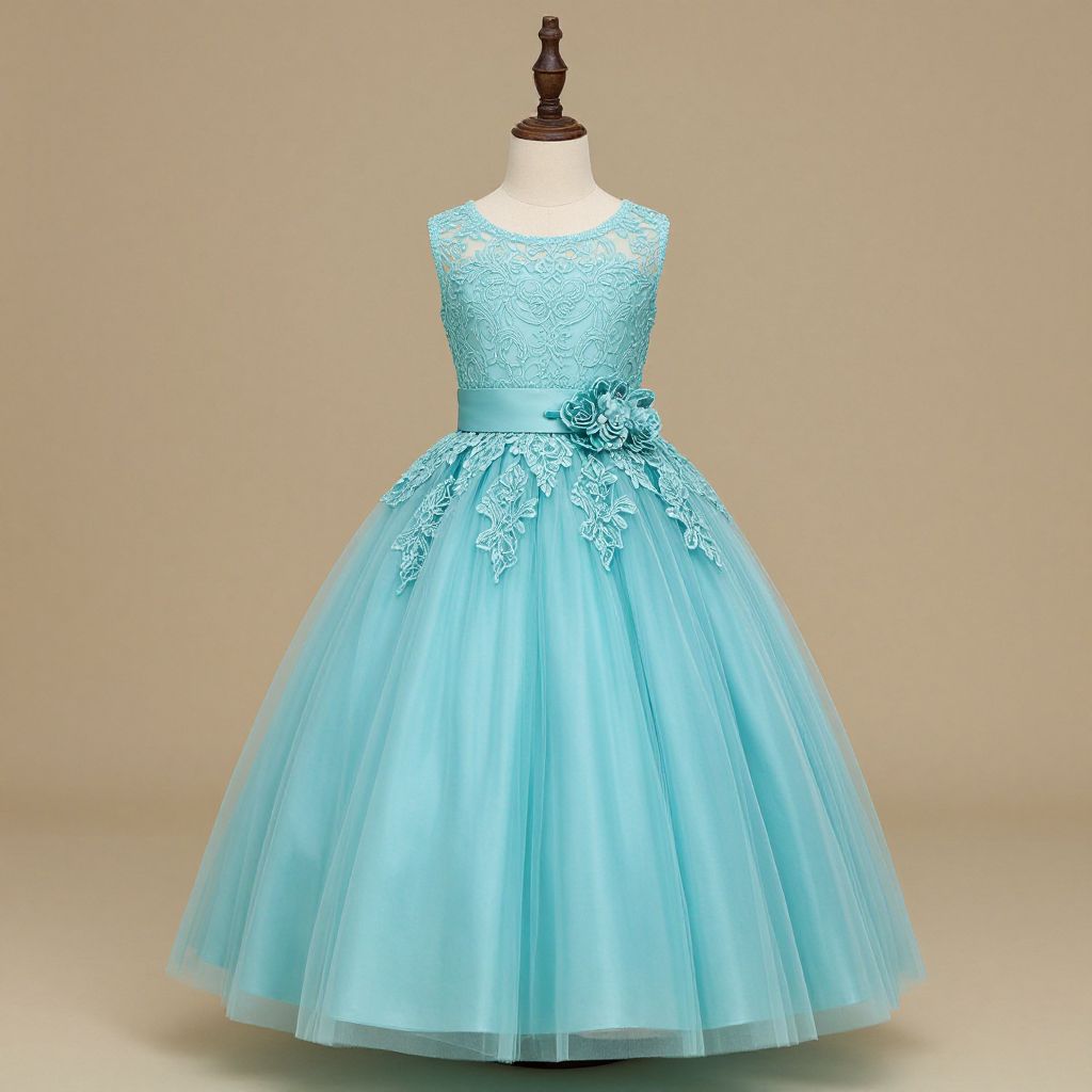 Elegant Ariel-inspired princess dress displayed on a mannequin, featuring a vibrant royal blue bodice with puffed sleeves and a flowing green skirt accented by light teal trim, set against a warm yellow background.