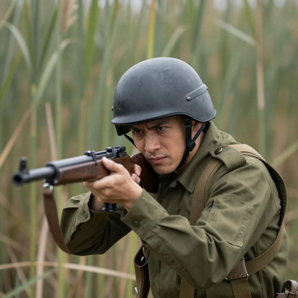 Soldier with intense expression, crouching in tall green and brown reeds, aiming a rifle forward. Wearing a black helmet and olive green uniform. Close-up shot, soldier in foreground, dense reeds in background. Photographic style.