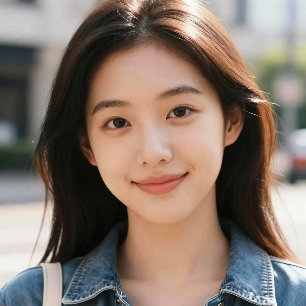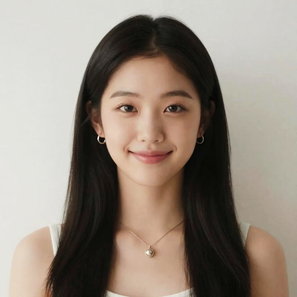 Portrait of a young Asian woman with long black hair, wearing a white sleeveless top. She has a happy smile and is adorned with simple jewelry, including small hoop earrings and a delicate necklace with a round pendant. The background is plain and simple, emphasizing her natural beauty and popular Korean makeup style.