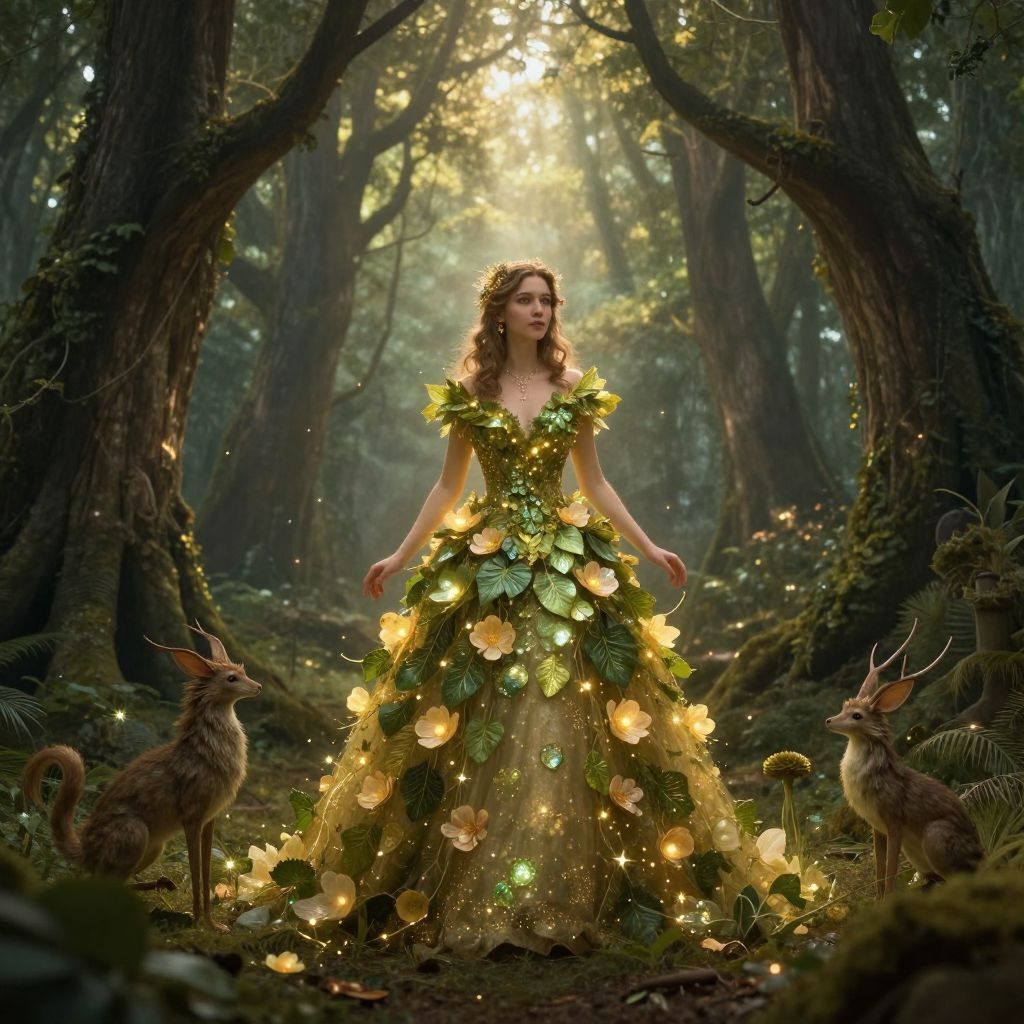 Enchanted forest fairy in a glowing, leaf-adorned ball gown, surrounded by mystical deer, illuminated by soft, magical light. Digital art