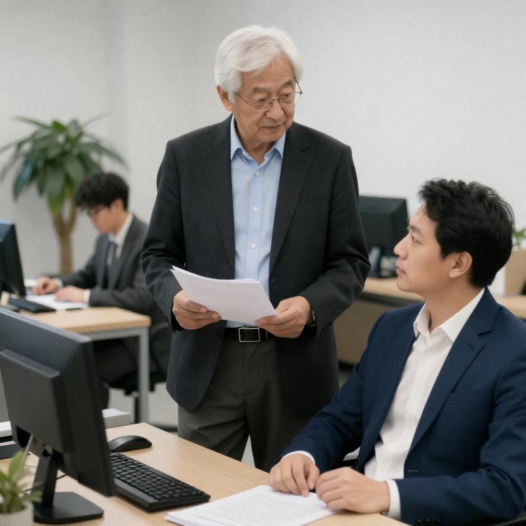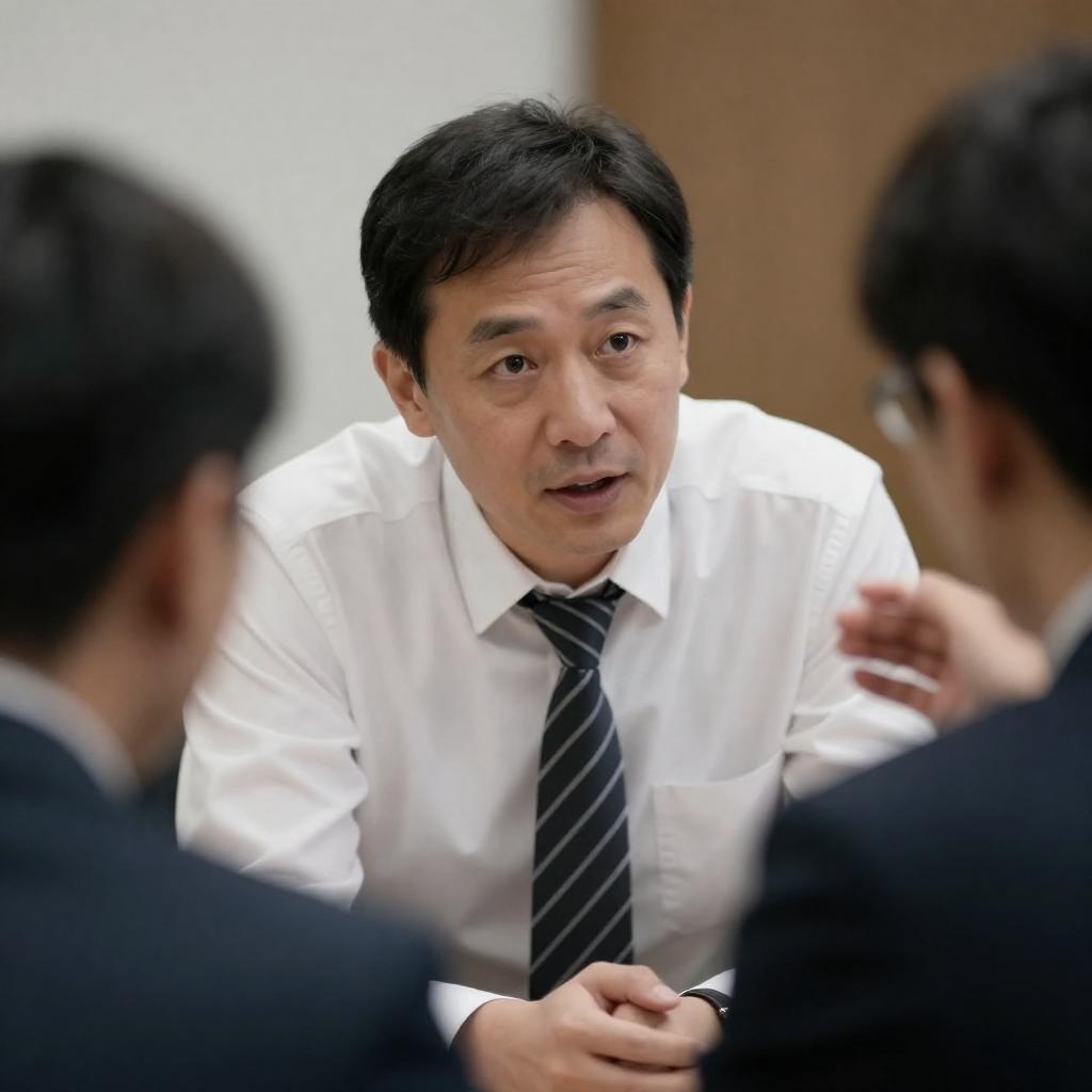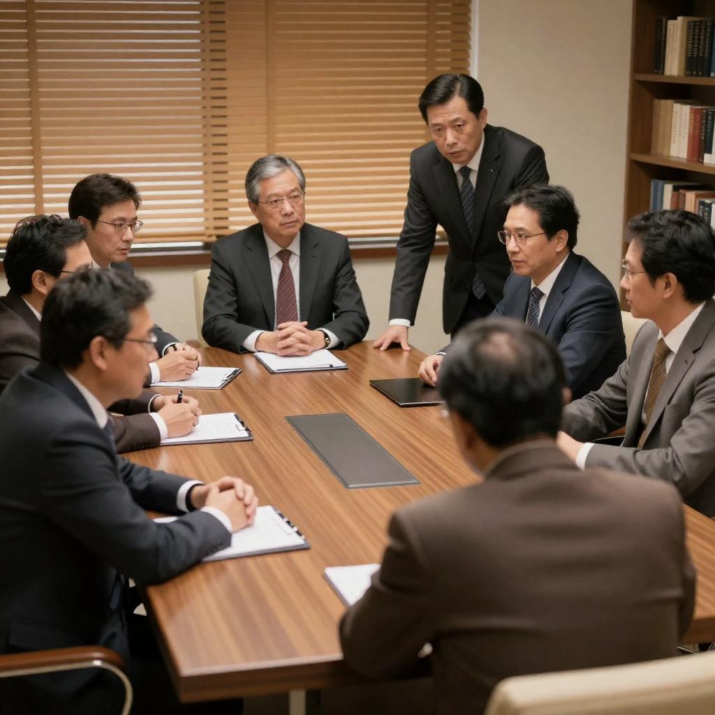 Photograph of a boardroom scene with nine middle-aged men in suits seated around a wooden table, focused on discussion. Warm lighting, wooden blinds, and bookshelves in the background. One man stands, others lean forward. Intense expressions. Yellow and brown color palette. A small inset shows a seated, somber man in a brown suit.