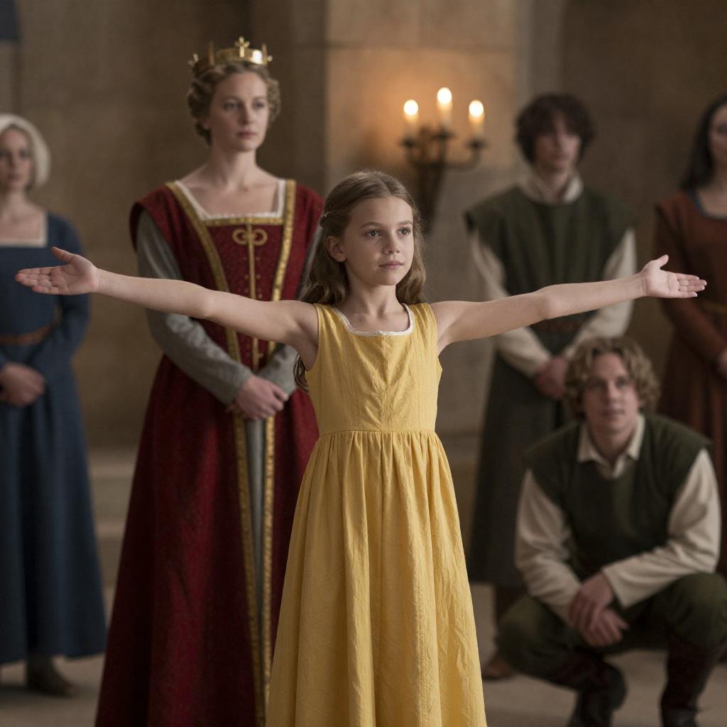 Group of medieval soldiers in colorful armor and robes stand in a circular stone room with arches. Centered, a woman in red dress stands with a sword. Other soldiers hold swords. Arched background with flags. Six people in foreground with backs to camera. Intense expressions on soldiers. Stone round table in center.